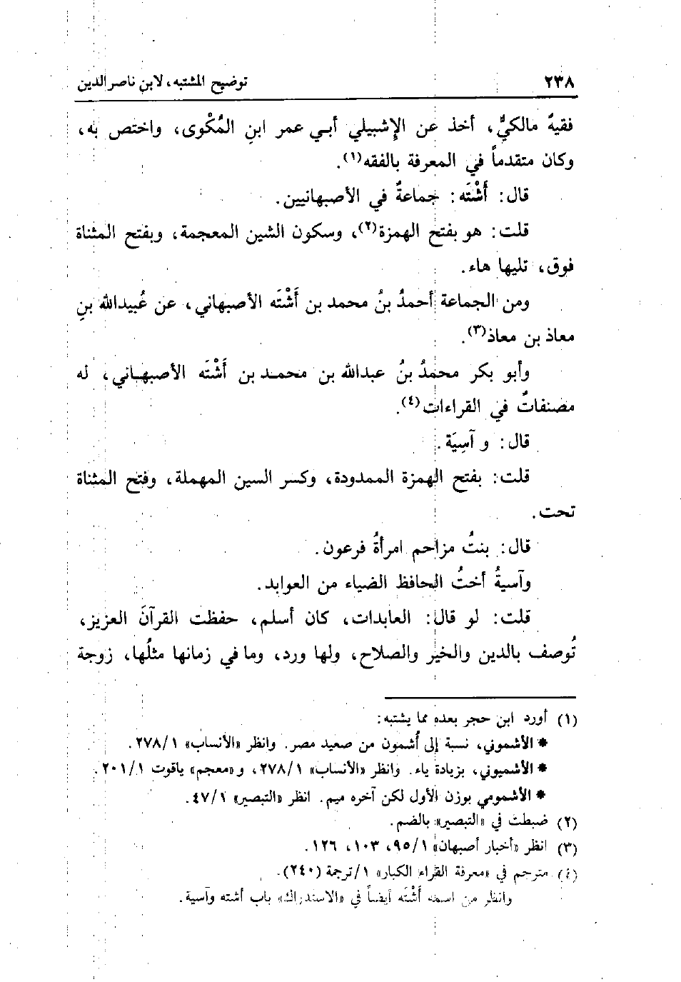 فَقِيه مالكي أَخذ عَن الاشبيلي أبي عمر ابْن المكوى واختص بِهِ وَكَانَ مُتَقَدما فِي الْمعرفَة بالفقه. قَالَ: اشته: جمَاعَة فِي الاصبهانيين. قلت: هُوَ بِفَتْح الْهمزَة وَسُكُون الشين الْمُعْجَمَة وبفتح الْمُثَنَّاة فَوق تَلِيهَا هَاء. وَمن الْجَمَاعَة أَحْمد بن مُحَمَّد بن اشته الاصبهاني عَن عبيد الله بن معَاذ بن معَاذ. وَأَبُو بكر مُحَمَّد بن عبد الله بن مُحَمَّد بن اشته الاصبهاني لَهُ مصنفات فِي الْقرَاءَات. قَالَ: وآسية قلت: بِفَتْح الْهمزَة الممدودة وَكسر السِّين الْمُهْملَة وَفتح الْمُثَنَّاة تَحت. قَالَ: بنت مُزَاحم امْرَأَة فِرْعَوْن. وآسية أُخْت الْحَافِظ الضياء من العوابد. قلت: لَو قَالَ: العابدات كَانَ اسْلَمْ حفظت الْقُرْآن الْعَزِيز تُوصَف بِالدّينِ وَالْخَيْر وَالصَّلَاح وَلها ورد وَمَا فِي زمانها مثلهَا زَوْجَة