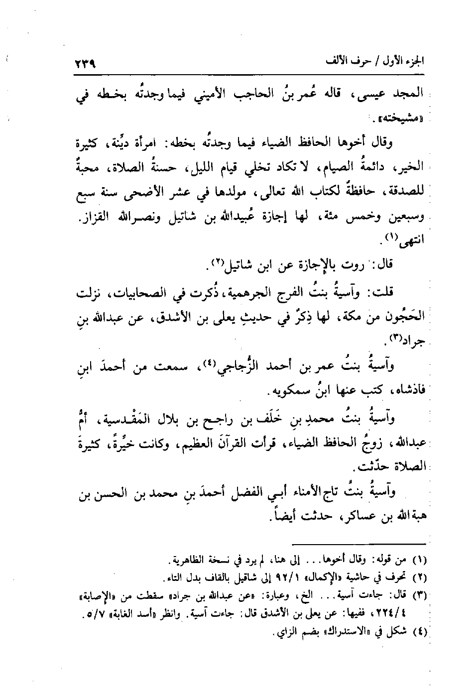 الْمجد عِيسَى قَالَه عمر بن الْحَاجِب الاميني فِيمَا وجدته بِخَطِّهِ فِي مشيخته. وَقَالَ اخوها الْحَافِظ الضياء فِيمَا وجدته بِخَطِّهِ: امْرَأَة دينة كَثِيرَة الْخَيْر دائمة الصّيام لَا تكَاد تخلي قيام اللَّيْل حَسَنَة الصَّلَاة محبَّة للصدقة حافظة لكتاب الله تَعَالَى مولدها فِي عشر الاضحى سنة سبع وَسبعين وَخمْس مئة لَهَا إجَازَة عبيد الله بن شاتيل وَنصر الله الْقَزاز. انْتهى. قَالَ: رَوَت بِالْإِجَازَةِ عَن ابْن شاتيل. قلت: وآسية بنت الْفرج الجرهمية ذكرت فِي الصحابيات نزلت الْحجُون من مَكَّة لَهَا ذكر فِي حَدِيث يعلى بن الاشدق عَن عبد الله بن جَراد. وآسية بنت عمر بن أَحْمد الزجاجي سَمِعت من أَحْمد ابْن فاذشاه كتب عَنْهَا ابْن سمكويه. وآسية بنت مُحَمَّد بن خلف بن رَاجِح بن بِلَال المقدسية أم عبد الله زوج الْحَافِظ الضياء قَرَأت الْقُرْآن الْعَظِيم وَكَانَت خيرة كَثِيرَة الصَّلَاة حدثت. وآسية بنت تَاج الامناء أبي الْفضل أَحْمد بن مُحَمَّد بن الْحسن بن هبة الله بن عَسَاكِر حدثت أَيْضا.