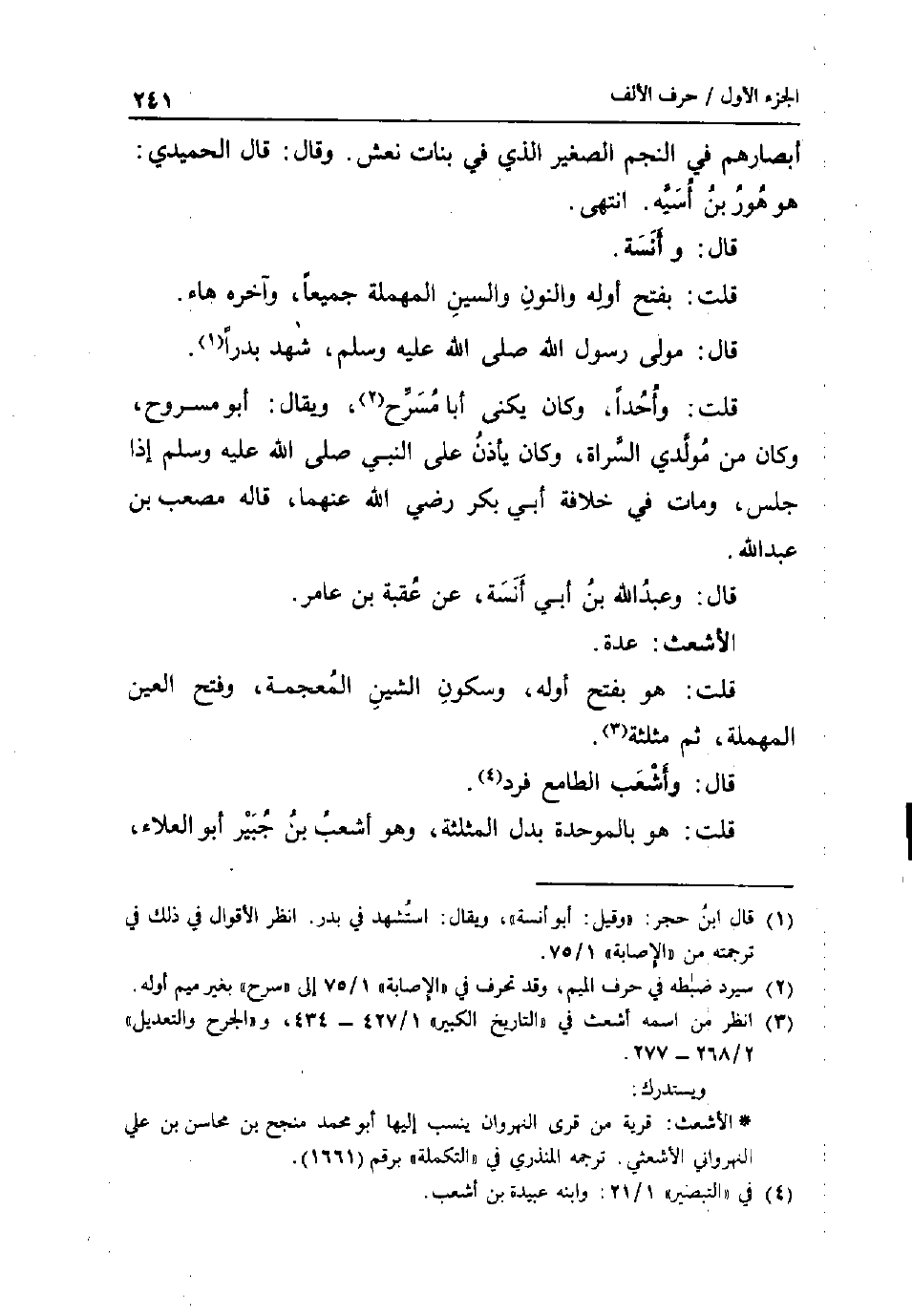 أَبْصَارهم فِي النَّجْم الصَّغِير الَّذِي فِي بَنَات نعش. وَقَالَ: قَالَ الْحميدِي: هُوَ هور بن اسيه. انْتهى. قَالَ: وأنسة. قلت: بِفَتْح أَوله وَالنُّون وَالسِّين الْمُهْملَة جَمِيعًا وَآخره هَاء. قَالَ: مولى رَسُول الله صلى الله عَلَيْهِ وَسلم شهد بَدْرًا. قلت: وَاحِدًا وَكَانَ يكنى أَبَا مسرح وَيُقَال: أَبُو مسروح وَكَانَ من مولدِي السراة وَكَانَ يَأْذَن على النَّبِي صلى الله عَلَيْهِ وَسلم إِذا جلس وَمَات فِي خلَافَة أبي بكر رَضِي الله عَنْهُمَا قَالَه مُصعب بن عبد الله. قَالَ: وَعبد الله بن أبي أنسة عَن عقبَة بن عَامر. الْأَشْعَث: عدَّة. قلت: هُوَ بِفَتْح اوله وَسُكُون الشين الْمُعْجَمَة وَفتح الْعين الْمُهْملَة ثمَّ مُثَلّثَة. قَالَ: وأشعب الطامع فَرد. قلت: هُوَ بِالْمُوَحَّدَةِ بدل الْمُثَلَّثَة وَهُوَ اشعب بن جُبَير أَبُو الْعَلَاء