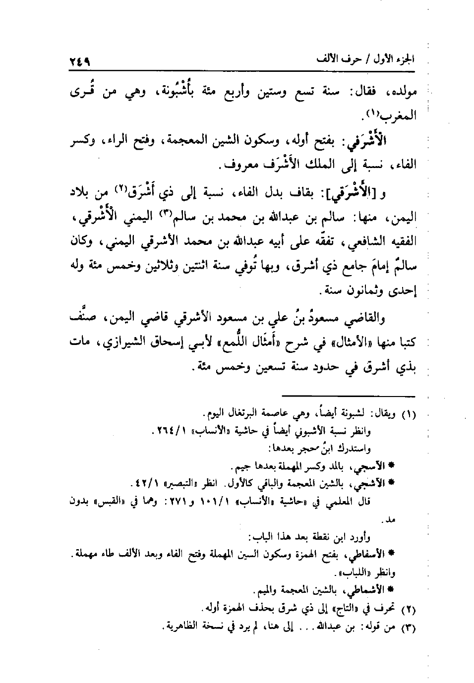 مولده فَقَالَ: سنة تسع وَسِتِّينَ وَأَرْبع مئة بأشبونة وَهِي من قرى الْمغرب. الاشرفي: بِفَتْح اوله وَسُكُون الشين الْمُعْجَمَة وَفتح الرَّاء وَكسر الْفَاء نِسْبَة إِلَى الْملك الاشرف مَعْرُوف. و [الاشرقي] : بقاف بدل الْفَاء نِسْبَة إِلَى ذِي اشرق من بِلَاد الْيمن مِنْهَا: سَالم بن عبد الله بن مُحَمَّد بن سَالم اليمني الاشرقي الْفَقِيه الشَّافِعِي تفقه على أَبِيه عبد الله بن مُحَمَّد الاشرقي اليمني وَكَانَ سَالم إِمَام جَامع ذِي اشرق وَبهَا توفّي سنة اثْنَتَيْنِ وَثَلَاثِينَ وَخمْس مئة وَله إِحْدَى وَثَمَانُونَ سنة. وَالْقَاضِي مَسْعُود بن عَليّ بن مَسْعُود الاشرقي قَاضِي الْيمن صنف كتبا مِنْهَا الامثال فِي شرح أَمْثَال اللمع لأبي إِسْحَاق الشِّيرَازِيّ مَاتَ بِذِي اشرق فِي حُدُود سنة تسعين وَخمْس مئة.