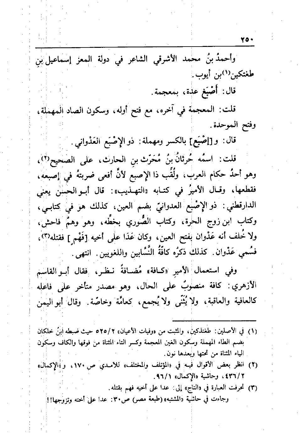 وَأحمد بن مُحَمَّد الاشرقي الشَّاعِر فِي دولة الْمعز إِسْمَاعِيل بن طغتكين بن أَيُّوب. قَالَ: اصبغ عدَّة بِمُعْجَمَة. قلت: الْمُعْجَمَة فِي آخِره مَعَ فتح اوله وَسُكُون الصَّاد الْمُهْملَة وَفتح الْمُوَحدَة. قَالَ: و [إِصْبَع] بِالْكَسْرِ ومهملة: ذُو الإصبع العدواني. قلت: اسْمه حرثان بن محرث بن الْحَارِث على الصَّحِيح وَهُوَ أحد حكام الْعَرَب ولقب ذَا الإصبع لِأَن افعى ضَربته فِي إصبعه فقطعها وَقَالَ الْأَمِير فِي كِتَابه التَّهْذِيب: قَالَ أَبُو الْحسن يَعْنِي الدَّارَقُطْنِيّ: ذُو الإصبع العدواني بِضَم الْعين كَذَلِك هُوَ فِي كتابي وَكتاب ابْن زوج الْحرَّة وَكتاب الصُّورِي بِخَطِّهِ وَهُوَ وهم فَاحش وَلَا خلف انه عدوان بِفَتْح الْعين وَكَانَ عدا على أَخِيه [فهم] فَقتله فَسُمي عدوان. كَذَلِك ذكره كَافَّة النسابين واللغويين. انْتهى. وَفِي اسْتِعْمَال الْأَمِير كَافَّة مُضَافَة نظر فَقَالَ أَبُو الْقَاسِم الْأَزْهَرِي: كَافَّة مَنْصُوب على الْحَال وَهُوَ مصدر مُتَأَخّر على فَاعله كالعافية وَالْعَاقبَة وَلَا يثنى وَلَا يجمع كعامة وخاصة. وَقَالَ أَبُو الْيمن