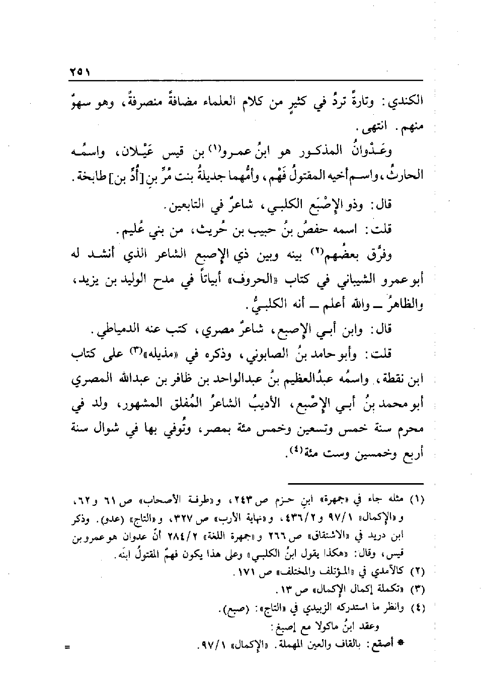الْكِنْدِيّ: وَتارَة ترد فِي كثير من كَلَام الْعلمَاء مُضَافَة منصرفة وَهُوَ سَهْو مِنْهُم. انْتهى. وعدوان الْمَذْكُور هُوَ ابْن عَمْرو بن قيس عيلان واسْمه الْحَارِث وَاسم أَخِيه الْمَقْتُول فهم وأمهما جديلة بنت مر بن [أد بن] طابخة. قَالَ: وَذُو الإصبع الْكَلْبِيّ شَاعِر فِي التَّابِعين. قلت: اسْمه حَفْص بن حبيب بن حُرَيْث من بني عليم. وَفرق بَعضهم بَينه وَبَين ذِي الإصبع الشَّاعِر الَّذِي انشد لَهُ أَبُو عَمْرو الشَّيْبَانِيّ فِي كتاب الْحُرُوف ابياتا فِي مدح الْوَلِيد بن يزِيد وَالظَّاهِر - وَالله أعلم - أَنه الْكَلْبِيّ. قَالَ: وَابْن أبي الاصبع شَاعِر مصري كتب عَنهُ الدمياطي. قلت: وَأَبُو حَامِد بن الصَّابُونِي وَذكره فِي مذيلة على كتاب ابْن نقطة واسْمه عبد الْعَظِيم بن عبد الْوَاحِد بن ظافر بن عبد الله الْمصْرِيّ أَبُو مُحَمَّد بن أبي الإصبع الأديب الشَّاعِر المفلق الْمَشْهُور ولد فِي محرم سنة خمس وَتِسْعين وَخمْس مئة بِمصْر وَتُوفِّي بهَا فِي شَوَّال سنة أَربع وَخمسين وست مئة.