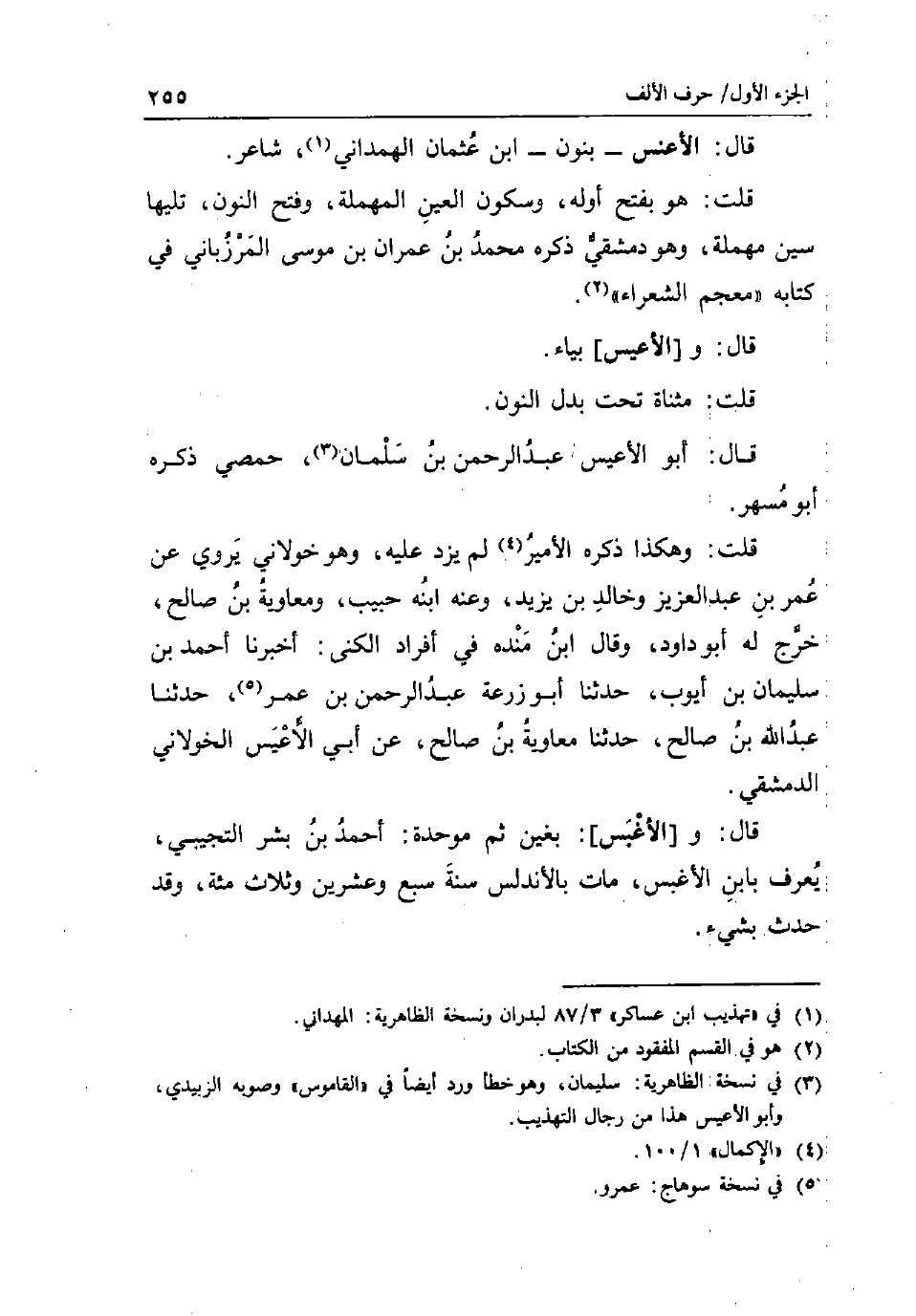 قَالَ: الاعنس - بنُون - ابْن عُثْمَان الْهَمدَانِي شَاعِر. قلت: هُوَ بِفَتْح اوله وَسُكُون الْعين الْمُهْملَة وَفتح النُّون تَلِيهَا سين مُهْملَة وَهُوَ دمشقي ذكره مُحَمَّد بن عمرَان بن مُوسَى المرزباني فِي كِتَابه مُعْجم الشُّعَرَاء. قَالَ: و [الاعيس] بياء. قلت: مثناة تَحت بدل النُّون. قَالَ: أَبُو الاعيس عبد الرَّحْمَن بن سلمَان حمصي ذكره أَبُو مسْهر. قلت: وَهَكَذَا ذكره الْأَمِير لم يزدْ عَلَيْهِ وَهُوَ خولاني يروي عَن عمر بن عبد الْعَزِيز وخَالِد بن يزِيد وَعنهُ ابْنه حبيب وَمُعَاوِيَة بن صَالح خرج لَهُ أَبُو دَاوُد وَقَالَ ابْن مَنْدَه فِي أَفْرَاد الكنى: أخبرنَا أَحْمد بن سُلَيْمَان بن ايوب حَدثنَا أَبُو زرْعَة عبد الرَّحْمَن بن عمر حَدثنَا عبد الله بن صَالح حَدثنَا مُعَاوِيَة بن صَالح عَن أبي الاعيس الْخَولَانِيّ الدِّمَشْقِي. قَالَ: و [الأغبس] : بغين ثمَّ مُوَحدَة: أَحْمد بن بشر التجِيبِي يعرف بِابْن الاغبس مَاتَ بالأندلس سنة سبع وَعشْرين وَثَلَاث مئة وَقد حدث بِشَيْء.