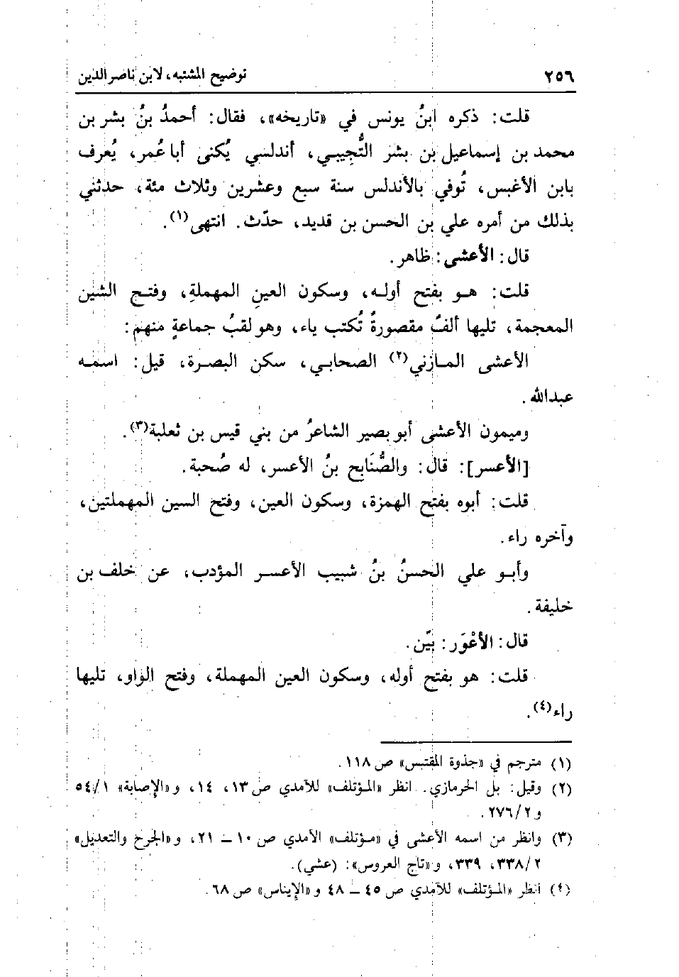 قلت: ذكره ابْن يُونُس فِي تَارِيخه فَقَالَ: أَحْمد بن بشر بن مُحَمَّد بن إِسْمَاعِيل بن بشر التجِيبِي أندلسي يكنى أَبَا عمر يعرف بِابْن الاغبس توفّي بالاندلس سنة سبع وَعشْرين وَثَلَاث مئة حَدثنِي بذلك من أمره عَليّ بن الْحسن بن قديد حدث. انْتهى. قَالَ: الْأَعْشَى: ظَاهر. قلت: هُوَ بِفَتْح اوله وَسُكُون الْعين الْمُهْملَة وَفتح الشين الْمُعْجَمَة تَلِيهَا ألف مَقْصُورَة تكْتب يَاء وَهُوَ لقب جمَاعَة مِنْهُم: الْأَعْشَى الْمَازِني الصَّحَابِيّ سكن الْبَصْرَة قيل: اسْمه عبد الله. وَمَيْمُون الْأَعْشَى أَبُو بَصِير الشَّاعِر من بني قيس بن ثَعْلَبَة. [الأعسر] : قَالَ: والصنابح بن الاعسر لَهُ صُحْبَة. قلت: أَبوهُ بِفَتْح الْهمزَة وَسُكُون الْعين وَفتح السِّين الْمُهْمَلَتَيْنِ وَآخره رَاء وَأَبُو عَليّ الْحسن بن شبيب الأعسر الْمُؤَدب عَن خلف بن خَليفَة. قَالَ: الْأَعْوَر: بَين. قلت: هُوَ بِفَتْح اوله وَسُكُون الْعين الْمُهْملَة وَفتح الْوَاو تَلِيهَا رَاء.