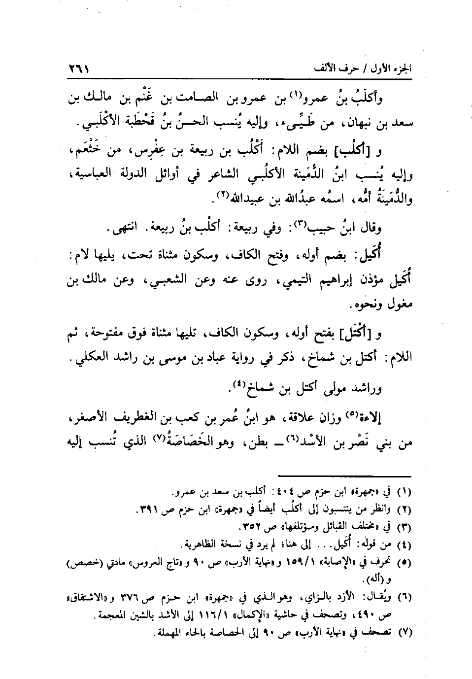 وأكلب بن عَمْرو بن عَمْرو بن الصَّامِت بن غنم بن مَالك بن سعد بن نَبهَان من طَيئ وَإِلَيْهِ ينْسب الْحسن بن قَحْطَبَةَ الاكلبي. و [أكلب] بِضَم اللَّام: اكلب بن ربيعَة بن عفرس من خثعم وَإِلَيْهِ ينْسب ابْن الدمينة الأكلبي الشَّاعِر فِي أَوَائِل الدولة العباسية والدمينة أمه اسْمه عبد الله بن عبيد الله. وَقَالَ ابْن حبيب: وَفِي ربيعَة: أكلب بن ربيعَة. انْتهى. أكيل: بِضَم اوله وَفتح الْكَاف وَسُكُون مثناة تَحت يَليهَا لَام: أكيل مُؤذن إِبْرَاهِيم التَّيْمِيّ روى عَنهُ وَعَن الشّعبِيّ وَعَن مَالك بن مغول وَنَحْوه. و [أَكْتَل] بِفَتْح اوله وَسُكُون الْكَاف تَلِيهَا مثناة فَوق مَفْتُوحَة ثمَّ اللَّام: اكتل بن شماخ ذكر فِي رِوَايَة عباد بن مُوسَى بن رَاشد العكلي. وَرَاشِد مولى اكتل بن شماخ. إلاءة وزان علاقَة هُوَ ابْن عمر بن كَعْب بن الغطريف الاصغر من بني نصر بن الْأسد - بطن وَهُوَ الْخَصَاصَة الَّذِي تنْسب إِلَيْهِ