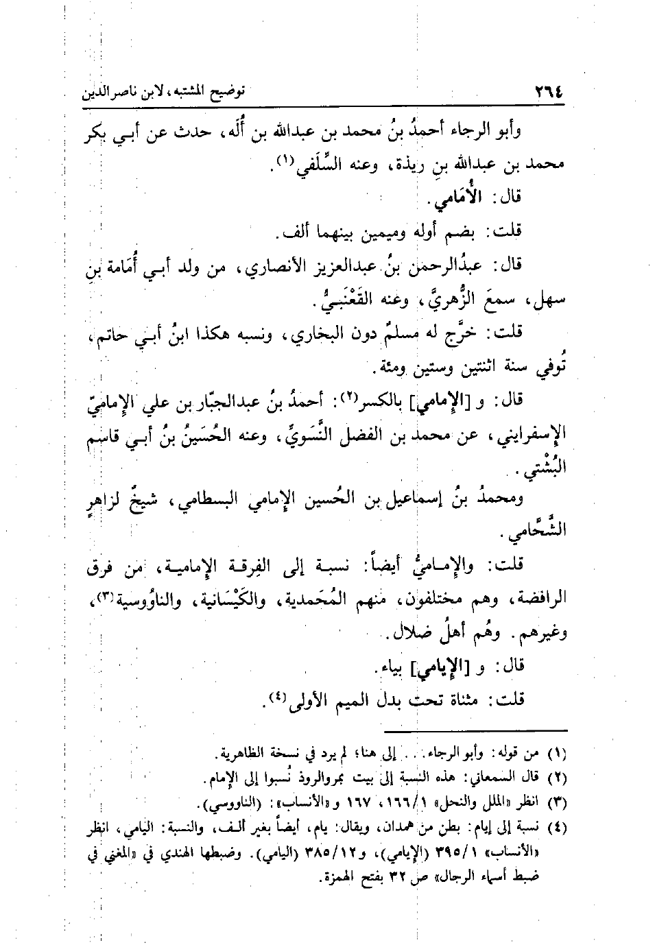 وَأَبُو الرَّجَاء أَحْمد بن مُحَمَّد بن عبد الله بن أَله حدث عَن أبي بكر مُحَمَّد بن عبد الله بن ريذة وَعنهُ السلَفِي. قَالَ: الأمامي. قلت: بِضَم أَوله وميمين بَينهمَا ألف. قَالَ: عبد الرَّحْمَن بن عبد الْعَزِيز الانصاري من ولد أبي أُمَامَة بن سهل سمع الزُّهْرِيّ وَعنهُ القعْنبِي. قلت: خرج لَهُ مُسلم دون البُخَارِيّ وَنسبه هَكَذَا ابْن أبي حَاتِم توفّي سنة اثْنَتَيْنِ وَسِتِّينَ ومئة. قَالَ: و [الإمامي] بِالْكَسْرِ: أَحْمد بن عبد الْجَبَّار بن عَليّ الإمامي الاسفرايني عَن مُحَمَّد بن الْفضل النسوي وَعنهُ الْحُسَيْن بن أبي قَاسم البشتي. وَمُحَمّد بن إِسْمَاعِيل بن الْحُسَيْن الإمامي البسطامي شيخ لزاهر الشحامي. قلت: والإمامي أَيْضا: نِسْبَة إِلَى الْفرْقَة الإمامية من فرق الرافضة وهم مُخْتَلفُونَ مِنْهُم المحمدية والكيسانية والناووسية وَغَيرهم وهم أهل ضلال. قَالَ: والإيامي] بياء. قلت: مثناة تَحت بدل الْمِيم الأولى.