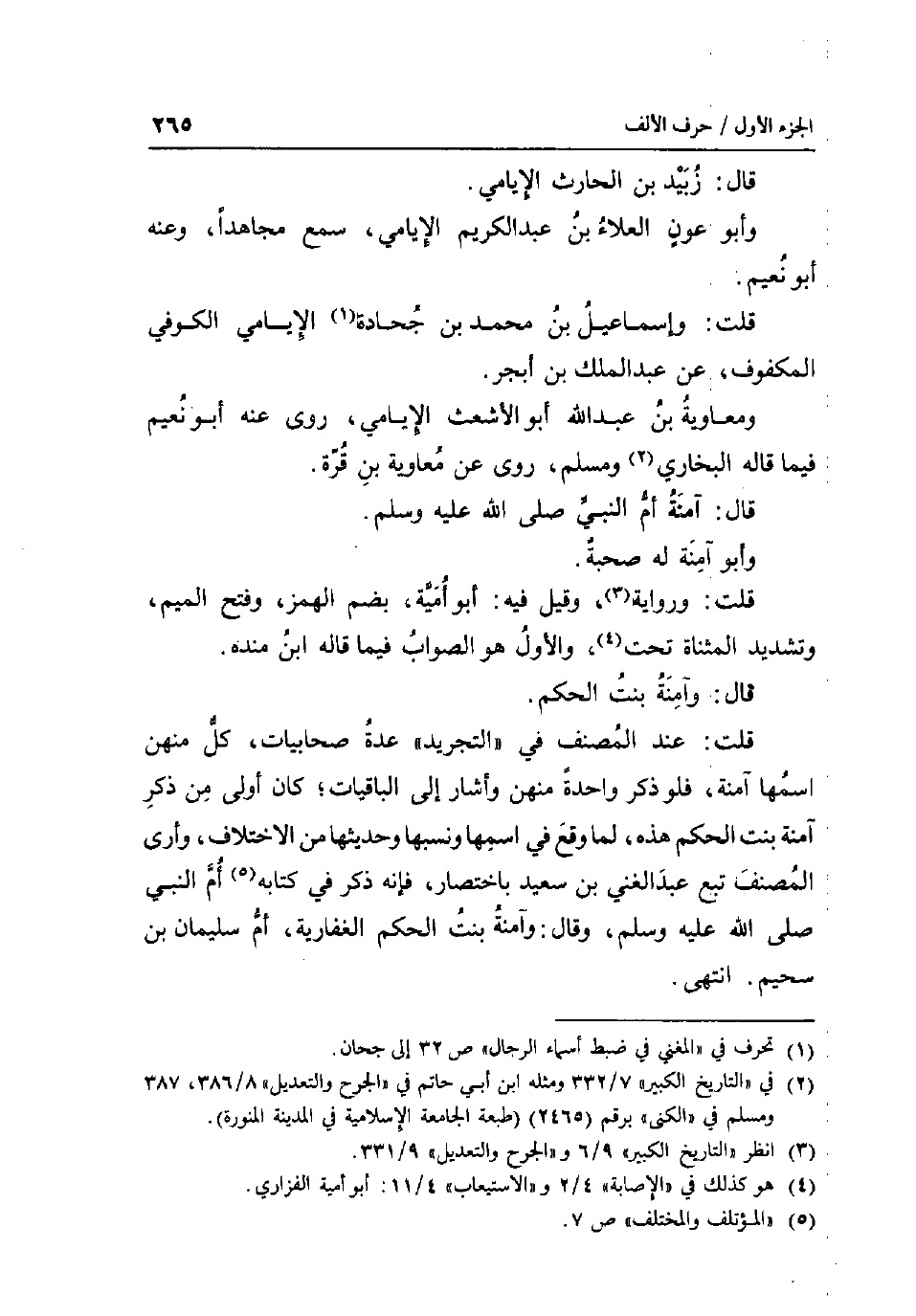 قَالَ: زبيد بن الْحَارِث الإيامي. وَأَبُو عون الْعَلَاء بن عبد الْكَرِيم الإيامي سمع مُجَاهدًا وَعنهُ أَبُو نعيم. قلت: وَإِسْمَاعِيل بن مُحَمَّد بن جحادة الإيامي الْكُوفِي المكفوف عَن عبد الْملك بن أبجر. وَمُعَاوِيَة بن عبد الله أَبُو الْأَشْعَث الإيامي روى عَنهُ أَبُو نعيم. فِيمَا قَالَه البُخَارِيّ وَمُسلم روى عَن مُعَاوِيَة بن قُرَّة. قَالَ: آمِنَة أم النَّبِي صلى الله عَلَيْهِ وَسلم. وَأَبُو آمِنَة لَهُ صُحْبَة. قلت: وَرِوَايَة وَقيل فِيهِ: أَبُو أُميَّة بِضَم الْهَمْز وَفتح الْمِيم وَتَشْديد الْمُثَنَّاة تَحت وَالْأول هُوَ الصَّوَاب فِيمَا قَالَه ابْن مَنْدَه. قَالَ: وآمنة بنت الحكم. قلت: عِنْد المُصَنّف فِي التَّجْرِيد عدَّة صحابيات كل مِنْهُنَّ أسمها آمِنَة فَلَو ذكر وَاحِدَة مِنْهُنَّ وَأَشَارَ إِلَى الْبَاقِيَات كَانَ أولى من ذكر آمِنَة بنت الحكم هَذِه لما وَقع فِي اسْمهَا ونسبها وحديثها من الِاخْتِلَاف وَأرى المُصَنّف تبع عبد الْغَنِيّ بن سعيد بِاخْتِصَار فَإِنَّهُ ذكر فِي كِتَابه أم النَّبِي صلى الله عَلَيْهِ وَسلم صلى الله عَلَيْهِ وَسلم وَقَالَ: وآمنة بنت الحكم الغفارية أم سُلَيْمَان بن سحيم. انْتهى.