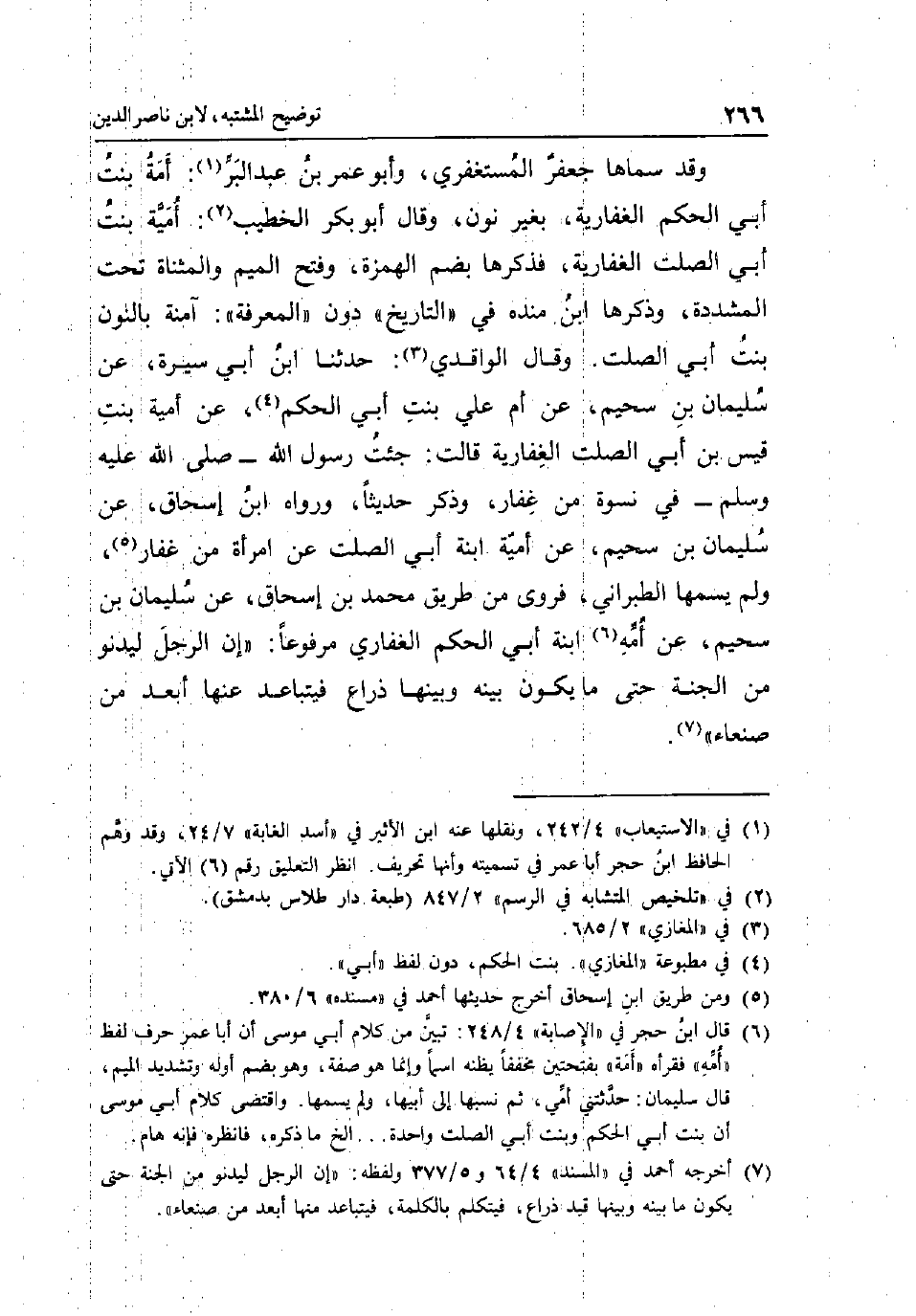 قَود سَمَّاهَا جَعْفَر المستغفري وَأَبُو عمر بن عبد الْبر: أمة بنت أبي الحكم الغفارية بِغَيْر نون وَقَالَ أَبُو بكر الْخَطِيب: أُميَّة بنت أبي الصَّلْت الغفارية فَذكرهَا بِضَم الْهمزَة وَفتح الْمِيم والمثناة تَحت الْمُشَدّدَة وَذكرهَا ابْن مَنْدَه فِي التَّارِيخ دون الْمعرفَة: آمِنَة بالنُّون بنت أبي الصَّلْت. وَقَالَ: الْوَاقِدِيّ: حَدثنَا ابْن أبي سيرة عَن سُلَيْمَان بن سحيم عَن أم عَليّ بنت أبي الحكم عَن أُميَّة بنت قيس بن أبي الصَّلْت الغفارية قَالَت: جِئْت رَسُول الله - صلى الله عَلَيْهِ وَسلم - فِي نسْوَة من غفار وَذكر حَدِيثا وَرَوَاهُ ابْن إِسْحَاق عَن سُلَيْمَان بن سحيم عَن أُميَّة ابْنة أبي الصَّلْت عَن امْرَأَة من غفار وَلم يسمهَا الطَّبَرَانِيّ فروى من طَرِيق مُحَمَّد بن إِسْحَاق عَن سُلَيْمَان بن سحيم عَن أمه ابْنة أبي الحكم الْغِفَارِيّ مَرْفُوعا: إِن الرجل ليدنو من الْجنَّة حَتَّى مَا يكون بَينه وَبَينهَا ذِرَاع فيتباعد عَنْهَا ابعد من صنعاء.