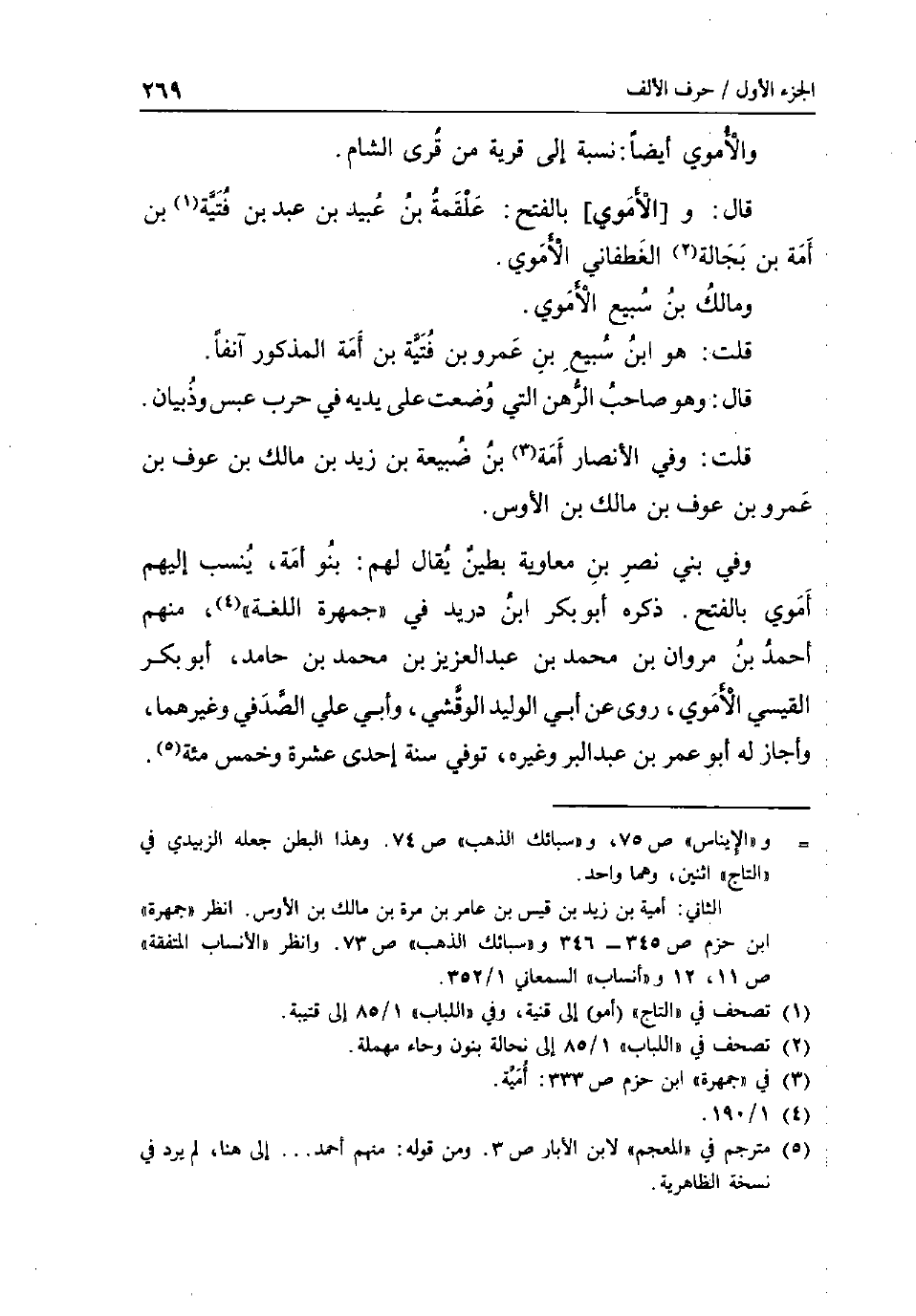 والأموي أَيْضا: نِسْبَة إِلَى قَرْيَة من قرى الشَّام. قَالَ: و [الْأمَوِي] بِالْفَتْح: عَلْقَمَة بن عبيد بن عبد بن فتية بن أمة بن بجالة الْغَطَفَانِي الاموي. وَمَالك بن سبيع الاموي. قلت: هُوَ ابْن سبيع بن عَمْرو بن فتية بن امة الْمَذْكُور آنِفا. قَالَ: وَهُوَ صَاحب الرَّهْن الَّتِي وضعت على يَدَيْهِ فِي حَرْب عبس وذبيان. قلت: وَفِي الْأَنْصَار أمة بن ضبيعة بن زيد بن مَالك بن عَوْف بن عَمْرو بن عَوْف بن مَالك بن الْأَوْس. وَفِي بني نصر بن مُعَاوِيَة بطين يُقَال لَهُم: بَنو أمة ينْسب إِلَيْهِم أموي بِالْفَتْح. ذكره أَبُو بكر ابْن دُرَيْد فِي جمهرة اللُّغَة مِنْهُم أَحْمد بن مَرْوَان بن مُحَمَّد بن عبد الْعَزِيز بن مُحَمَّد بن حَامِد أَبُو بكر الْقَيْسِي الاموي روى عَن أبي الْوَلِيد الوقشي وابي عَليّ الصَّدَفِي وَغَيرهمَا وَأَجَازَ لَهُ أَبُو عمر بن عبد الْبر وَغَيره توفّي سنة إِحْدَى عشرَة وَخمْس مئة.