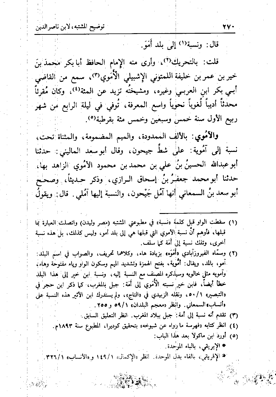 قَالَ: وَنسبَة إِلَى بلد أمو. قلت: بِالتَّحْرِيكِ وَأرى مِنْهُ الإِمَام الْحَافِظ أَبَا بكر مُحَمَّد بن خير بن عمر بن خَليفَة اللمتوني الاشبيلي الْأمَوِي سمع من القَاضِي أبي بكر ابْن الْعَرَبِيّ وَغَيره ومشيخته تزيد عَن المئة وَكَانَ مقرئا مُحدثا أديبا لغويا نحويا وَاسع الْمعرفَة توفّي فِي لَيْلَة الرَّابِع من شهر ربيع الأول سنة خمس وَسبعين وَخمْس مئة بقرطبة. والآموي: بِالْألف الممدودة وَالْمِيم المضمومة والمثناة تَحت نِسْبَة إِلَى آموية: على شط جيحون وَقَالَ أَبُو سعد الْمَالِينِي: حَدثنَا أَبُو عبد الله الْحُسَيْن بن عَليّ بن مُحَمَّد بن مَحْمُود الآموي الزَّاهِد بهَا حَدثنَا أَبُو مُحَمَّد جَعْفَر بن إِسْحَاق الرَّازِيّ وَذكر حَدِيثا وَصحح أَبُو سعد بن السَّمْعَانِيّ أَنَّهَا آمل جيحون وَالنِّسْبَة إِلَيْهَا آملي. قَالَ: وَيَقُول