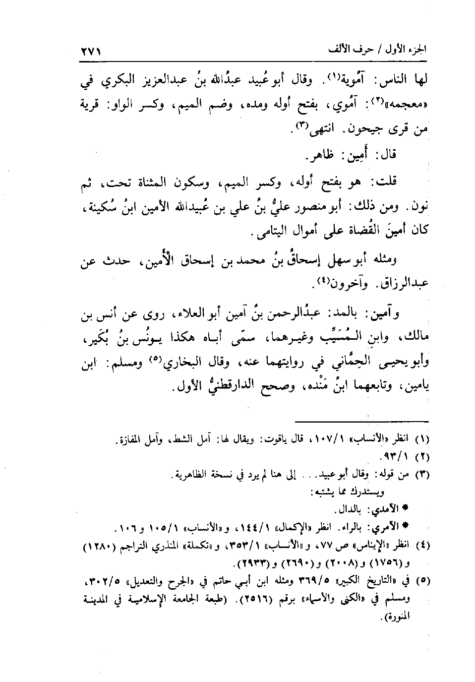 لَهَا النَّاس: آموية. وَقَالَ أَبُو عبيد عبد الله بن عبد الْعَزِيز الْبكْرِيّ فِي مُعْجمَة: آموي بِفَتْح أَوله ومده وَضم الْمِيم وَكسر الْوَاو: قَرْيَة من قرى جيحون. انْتهى. قَالَ: أَمِين: ظَاهر. قلت: هُوَ بِفَتْح اوله وَكسر الْمِيم وَسُكُون الْمُثَنَّاة تَحت ثمَّ نون. وَمن ذَلِك: أَبُو مَنْصُور عَليّ بن عَليّ بن عبيد الله الْأمين ابْن سكينَة كَانَ أَمِين الْقُضَاة على أَمْوَال الْيَتَامَى. وَمثله أَبُو سهل إِسْحَاق بن مُحَمَّد بن إِسْحَاق الامين حدث عَن عبد الرَّزَّاق. وَآخَرُونَ. وَأمين: بِالْمدِّ: عبد الرَّحْمَن بن آمين أَبُو الْعَلَاء روى عَن أنس بن مَالك وَابْن الْمسيب وَغَيرهمَا سمى أَبَاهُ هَكَذَا يُونُس بن بكير وَأَبُو يحيى الْحمانِي فِي روايتهما عَنهُ وَقَالَ البُخَارِيّ وَمُسلم: ابْن يَامِين وتابعهما ابْن مَنْدَه وَصحح الدَّارَقُطْنِيّ الأول.