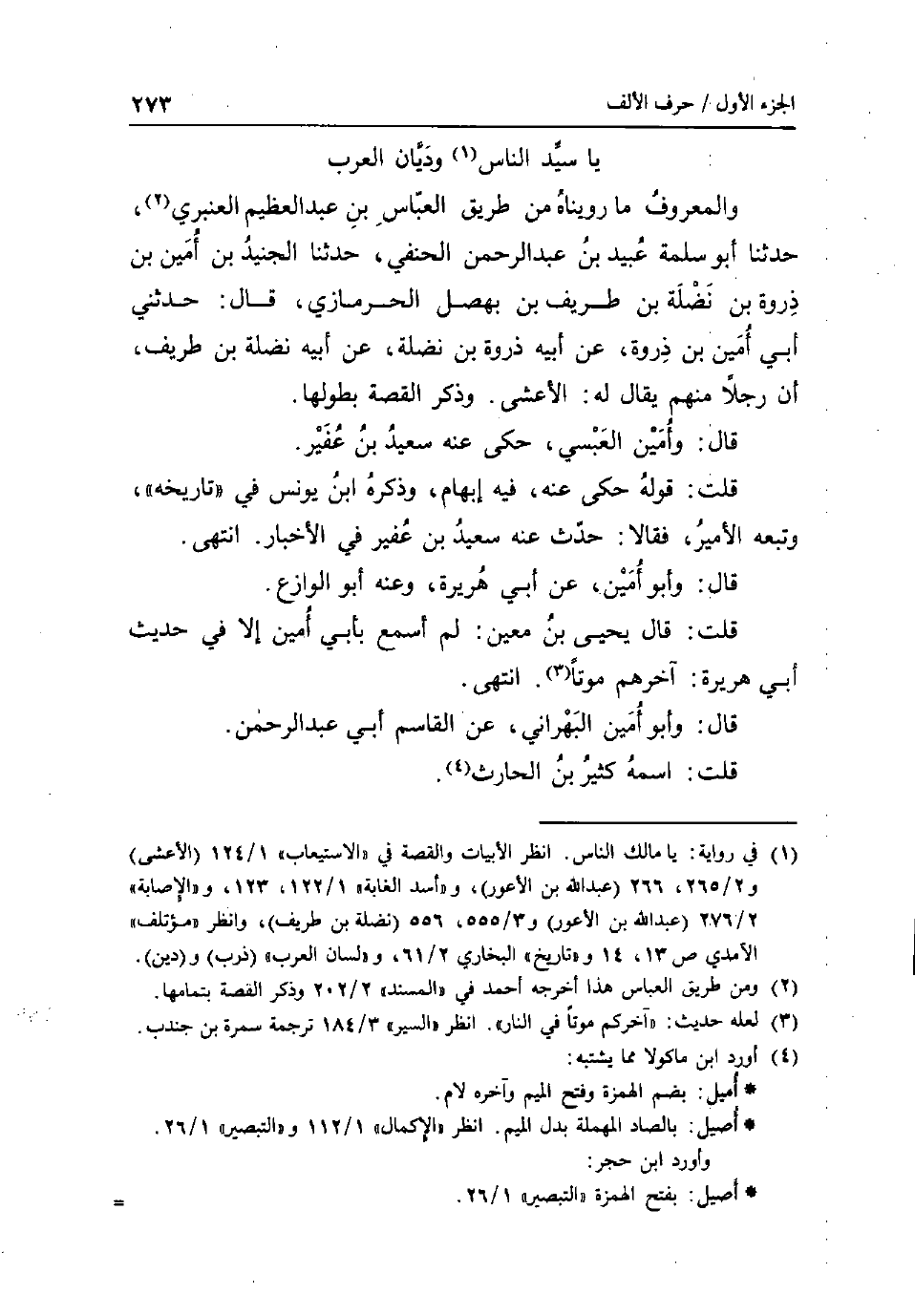 وَالْمَعْرُوف مَا روينَاهُ من طَرِيق الْعَبَّاس بن عبد الْعَظِيم الْعَنْبَري حَدثنَا أَبُو سَلمَة عبيد بن عبد الرَّحْمَن الْحَنَفِيّ حَدثنَا الْجُنَيْد بن أَمِين بن ذرْوَة بن نَضْلَة بن طريف بن بهصل الحرمازي قَالَ: حَدثنِي أبي أَمِين بن ذرْوَة عَن أَبِيه ذرْوَة بن نَضْلَة عَن أَبِيه نَضْلَة بن طريف أَن رجلا مِنْهُم يُقَال لَهُ: الْأَعْشَى. وَذكر الْقِصَّة بِطُولِهَا. قَالَ: وَأمين الْعَبْسِي حكى عَنهُ سعيد بن عفير. قلت: قَوْله حكى عَنهُ فِيهِ إِبْهَام وَذكره ابْن يُونُس فِي تَارِيخه وَتَبعهُ الامير فَقَالَا: حدث عَنهُ سعيد بن عفير فِي الاخبار. انْتهى. قَالَ: وَأَبُو أَمِين عَن أبي هُرَيْرَة وَعنهُ أَبُو الوزاع. قلت: قَالَ: يحيى بن معِين: لم اسْمَع بِأبي أَمِين إِلَّا فِي حَدِيث أبي هُرَيْرَة: آخِرهم موتا. انْتهى. قَالَ: وَأَبُو آمين البهراني عَن الْقَاسِم أبي عبد الرَّحْمَن. قلت: اسْمه كثير بن الْحَارِث.