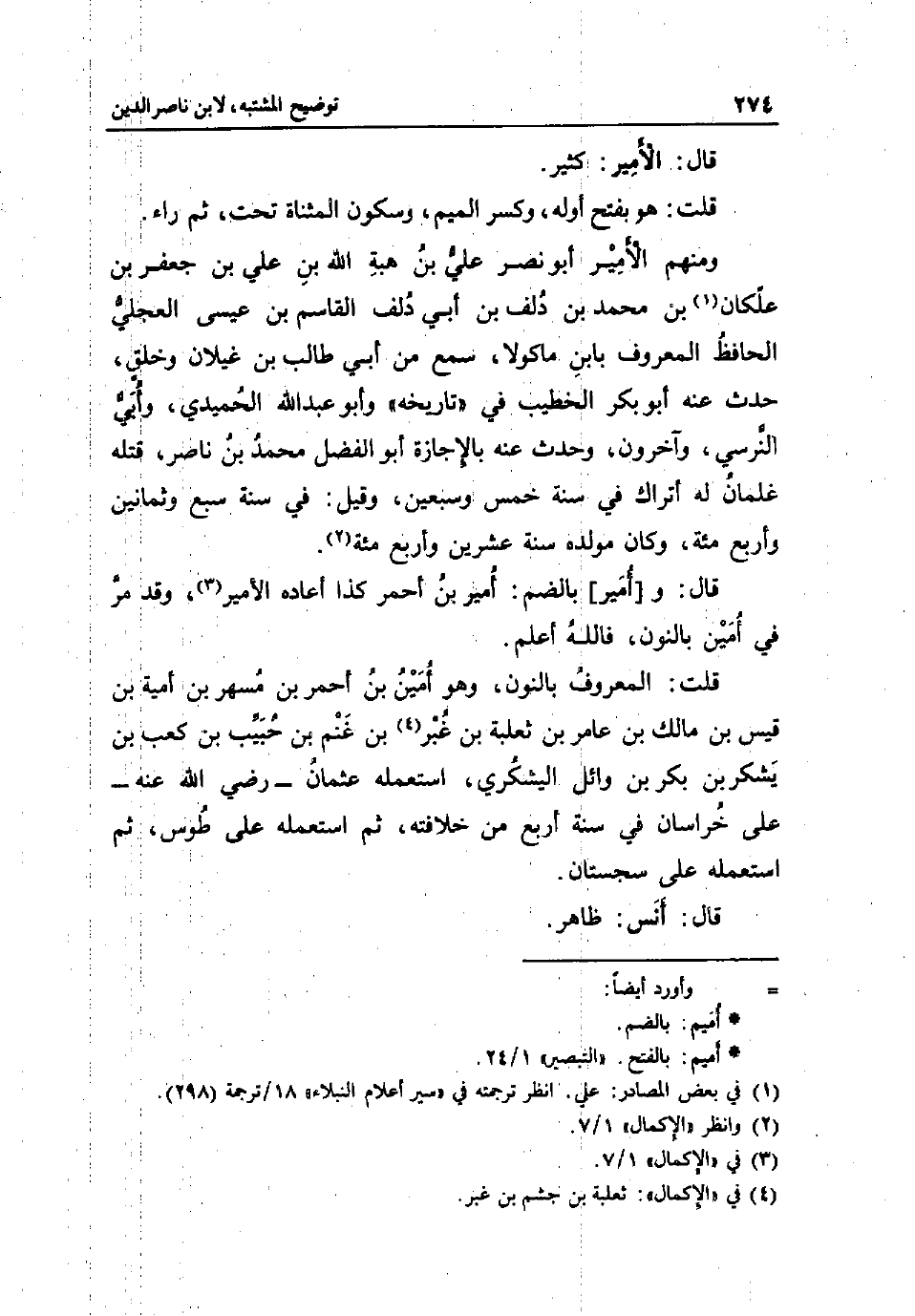 قَالَ: الْأَمِير: كثير. قلت: هُوَ بِفَتْح أَوله وَكسر الْمِيم وَسُكُون الْمُثَنَّاة تَحت ثمَّ رَاء. وَمِنْهُم الْأَمِير أَبُو نصر عَليّ بن هبة الله بن عَليّ بن جَعْفَر بن علكان بن مُحَمَّد بن دلف بن أبي دلف الْقَاسِم بن عِيسَى الْعجلِيّ الْحَافِظ الْمَعْرُوف بِابْن مَاكُولَا سمع من أبي طَالب بن غيلَان وَخلق حدث عَنهُ أَبُو بكر الْخَطِيب فِي تَارِيخه وَأَبُو عبد الله الْحميدِي وَأبي النَّرْسِي وَآخَرُونَ وَحدث عَنهُ بِالْإِجَازَةِ أَبُو الْفضل مُحَمَّد بن نَاصِر قَتله غلْمَان لَهُ أتراك فِي سنة خمس وَسبعين وَقيل: فِي سنة سبع وَثَمَانِينَ وَأَرْبع مئة وَكَانَ مولده سنة عشْرين وَأَرْبع مئة. قَالَ: و [أَمِير] بِالضَّمِّ: أَمِير بن احمر كَذَا أَعَادَهُ الْأَمِير وَقد مر فِي أَمِين بالنُّون فَالله أعلم. قلت: الْمَعْرُوف بالنُّون وَهُوَ أَمِين بن احمر بن مسْهر بن أُميَّة بن قيس بن مَالك بن عَامر بن ثَعْلَبَة بن غبر بن غنم بن حبيب بن كَعْب بن يشْكر بن بكر بن وَائِل الْيَشْكُرِي اسْتَعْملهُ عُثْمَان - رَضِي الله عَنهُ - على خُرَاسَان فِي سنة أَربع من خِلَافَته ثمَّ اسْتَعْملهُ على طوس ثمَّ اسْتَعْملهُ على سجستان. قَالَ: أنس: ظَاهر.