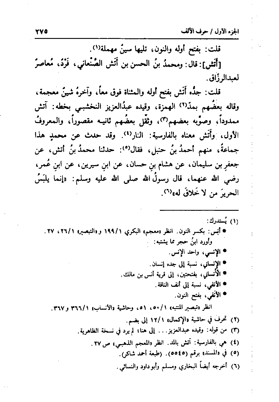 قلت: بِفَتْح أَوله وَالنُّون تَلِيهَا سين مُهْملَة. [أتش] : قَالَ: وَمُحَمّد بن الْحسن بن أتش الصَّنْعَانِيّ فَرد معاصر لعبد الرَّزَّاق. قلت: جده اتش بِفَتْح أَوله والمثناة فَوق مَعًا وَآخره شين مُعْجمَة وَقَالَهُ بَعضهم بِمد الْهمزَة وَقَيده عبد الْعَزِيز النخشبي بِخَطِّهِ: آتش ممدودا وَصَوَّبَهُ بَعضهم وَثقل بَعضهم ثَانِيه مَقْصُورا وَالْمَعْرُوف الأول وأتش مَعْنَاهُ بِالْفَارِسِيَّةِ: النَّار. وَقد حدث عَن مُحَمَّد هَذَا جمَاعَة مِنْهُم أَحْمد بن حَنْبَل فَقَالَ: حَدثنَا مُحَمَّد بن اتش عَن جَعْفَر بن سُلَيْمَان عَن هِشَام بن حسان عَن ابْن سِيرِين عَن ابْن عمر رَضِي الله عَنْهُمَا قَالَ رَسُول الله صلى الله عَلَيْهِ وَسلم: إِنَّمَا يلبس الْحَرِير من لَا خلاق لَهُ.