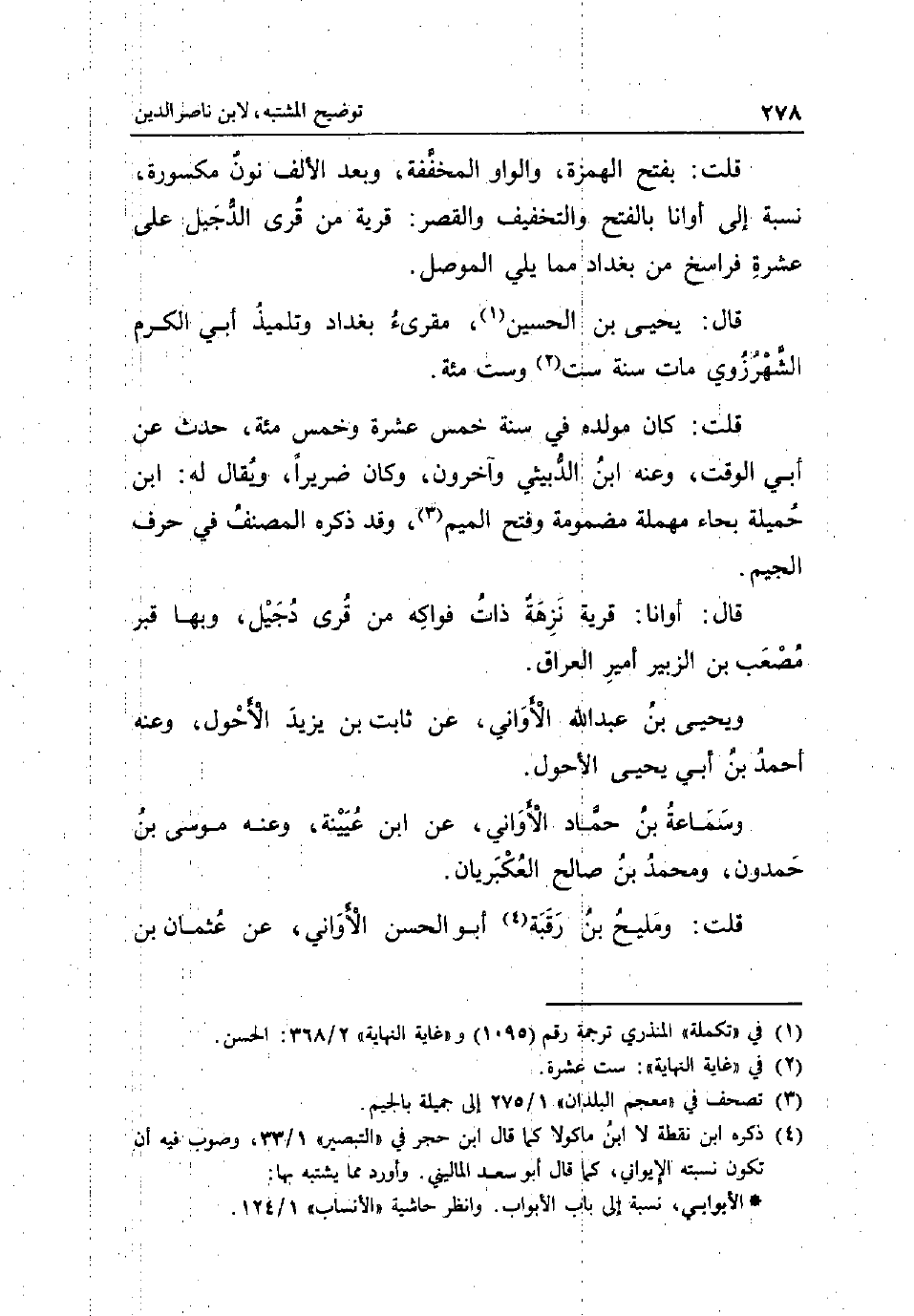 قلت: بِفَتْح الْهمزَة وَالْوَاو المخففة وَبعد الْألف نون مَكْسُورَة نِسْبَة إِلَى أوانا بِالْفَتْح وَالتَّخْفِيف وَالْقصر: قَرْيَة من قرى الدجيل على عشرَة فراسخ من بَغْدَاد مِمَّا يَلِي الْموصل. قَالَ: يحيى بن الْحُسَيْن مقرئ بَغْدَاد وتلميذ أبي الْكَرم الشهرزوي مَاتَ سنة سِتّ وست مئة. قلت: كَانَ مولده فِي سنة خمس عشرَة وَخمْس مئة حدث عَن أبي الْوَقْت وَعنهُ ابْن الدبيثي وَآخَرُونَ وَكَانَ ضريرا وَيُقَال لَهُ: ابْن حميلة بحاء مُهْملَة مَضْمُومَة وَفتح الْمِيم وَقد ذكره المُصَنّف فِي حرف الْجِيم. قَالَ: أوانا: قَرْيَة نزهة ذَات فواكه من قرى دجيل وَبهَا قبر مُصعب بن الزبير أَمِير الْعرَاق. وَيحيى بن عبد الله الْأَوَانِي عَن ثَابت بن يزِيد الاحول وَعنهُ أَحْمد بن أبي يحيى الْأَحول. وسماعة بن حَمَّاد الْأَوَانِي عَن ابْن عُيَيْنَة وَعنهُ مُوسَى بن حمدون وَمُحَمّد بن صَالح العكبريان. قلت: ومليح بن رَقَبَة أَبُو الْحسن الاواني عَن عُثْمَان بن