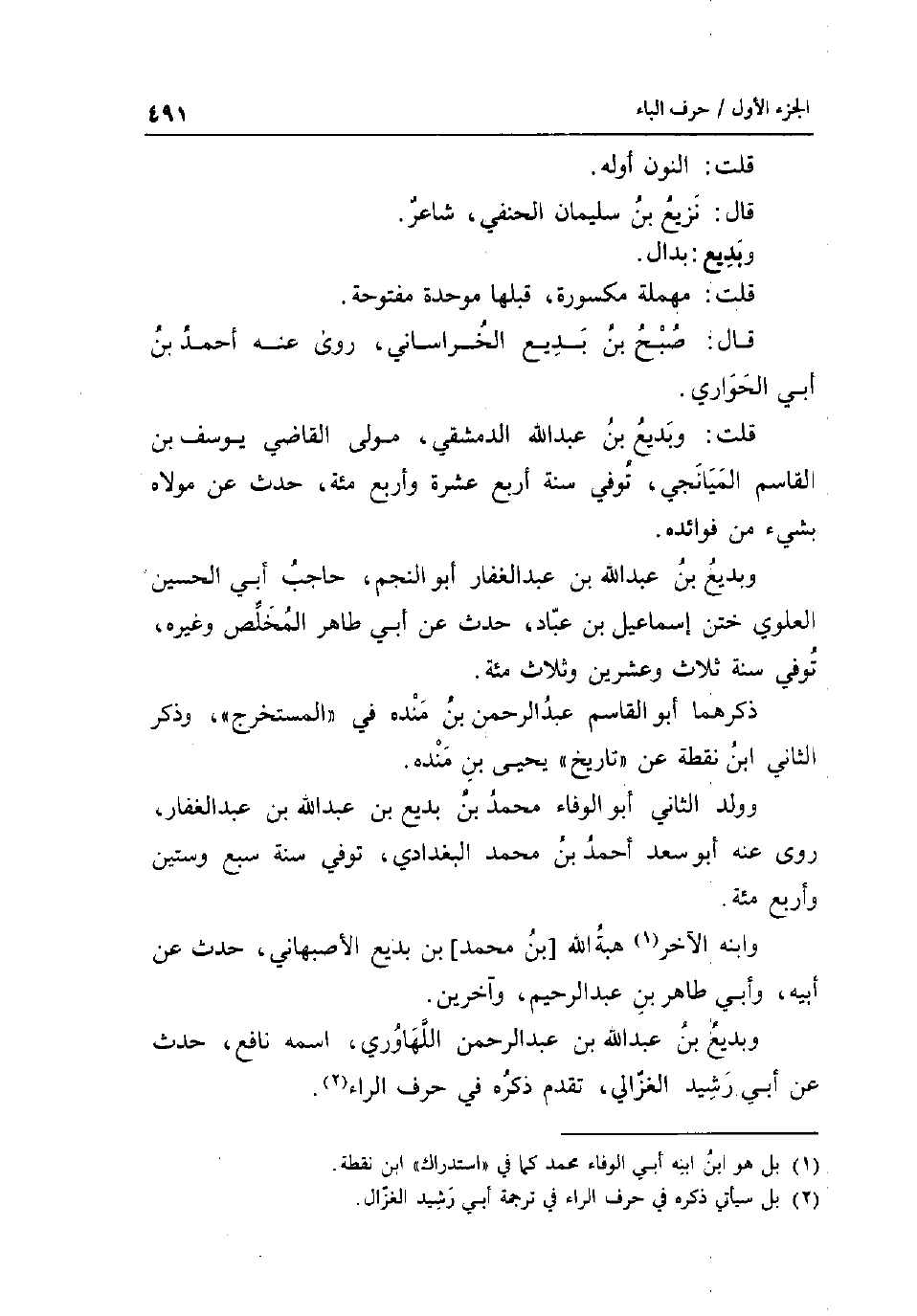 قلت: النُّون أَوله قَالَ: نزيع بن سُلَيْمَان الْحَنَفِيّ شَاعِر وبديع: بدال قلت: مُهْملَة مَكْسُورَة قبلهَا مُوَحدَة مَفْتُوحَة قَالَ: صبح بن بديع الْخُرَاسَانِي روى عَنهُ أَحْمد بن أبي الْحوَاري قلت: وبديع بن عبد الله الدِّمَشْقِي مولى القَاضِي يُوسُف بن الْقَاسِم الميانجي توفّي سنة أَربع عشرَة وَأَرْبع مئة حدث عَن مَوْلَاهُ بِشَيْء من فَوَائده وبديع بن عبد الله بن عبد الْغفار أَبُو النَّجْم حَاجِب أبي الْحُسَيْن الْعلوِي ختن إِسْمَاعِيل بن عباد حدث عَن أبي طَاهِر المخلص وَغَيره توفّي سنة ثَلَاث وَعشْرين وَثَلَاث مئة ذكرهمَا أَبُو الْقَاسِم عبد الرَّحْمَن بن مَنْدَه فِي الْمُسْتَخْرج وَذكر الثَّانِي ابْن نقطة عَن تَارِيخ يحيى بن مَنْدَه وَولد الثَّانِي أَبُو الْوَفَاء مُحَمَّد بن بديع بن عبد الله بن عبد الْغفار روى عَنهُ أَبُو سعد أَحْمد بن مُحَمَّد الْبَغْدَادِيّ توفّي سنة سبع وَسِتِّينَ وَأَرْبع مئة وَابْنه الآخر هبة الله [بن مُحَمَّد] بن بديع الاصبهاني حدث عَن أَبِيه وابي طَاهِر بن عبد الرَّحِيم وَآخَرين وبديع بن عبد الله بن عبد الرَّحْمَن اللهاوري اسْمه نَافِع حدث عَن أبي رشيد الْغَزالِيّ تقدم ذكره فِي حرف الرَّاء.