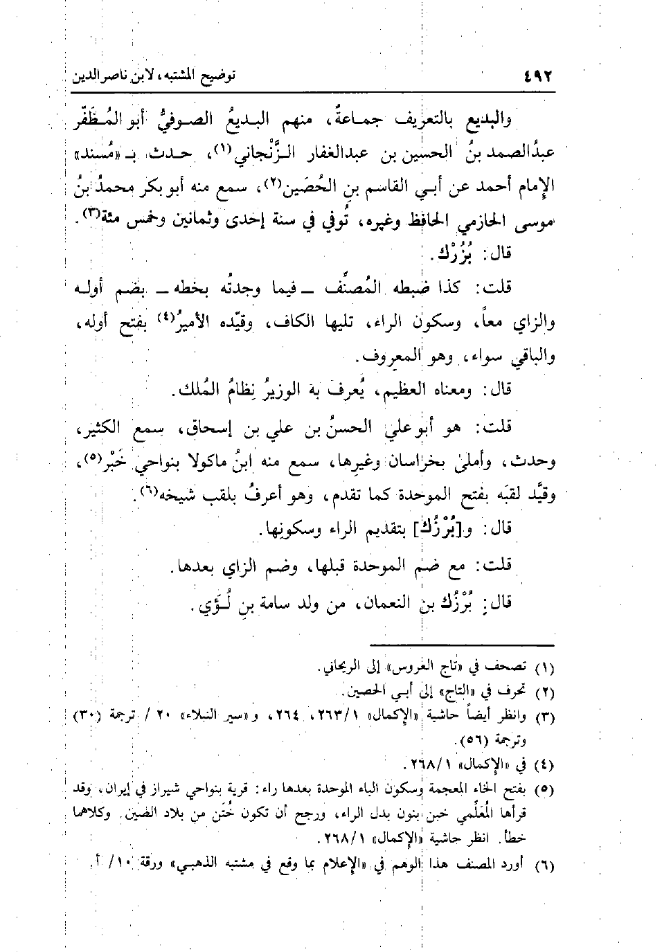 والبديع بالتعريف جمَاعَة مِنْهُم البديع الصُّوفِي أَبُو المظفر عبد الصَّمد بن الْحُسَيْن بن عبد الْغفار الزنجاني حدث بِمُسْنَد الإِمَام أَحْمد بن أبي الْقَاسِم بن الْحصين سمع مِنْهُ أَبُو بكر مُحَمَّد بن مُوسَى الْحَازِمِي الْحَافِظ وَغَيره توفّي فِي سنة إِحْدَى وَثَمَانِينَ وَخمْس مئة قَالَ بزرك قلت: كَذَا ضَبطه المُصَنّف - فِيمَا وجدته بِخَطِّهِ - بِضَم أَوله وَالزَّاي مَعًا وَسُكُون الرَّاء تَلِيهَا الْكَاف وَقَيده الْأَمِير بِفَتْح اوله وَالْبَاقِي سَوَاء وَهُوَ الْمَعْرُوف قَالَ: وَمَعْنَاهُ الْعَظِيم يعرف بِهِ الْوَزير نظام الْملك قلت: هُوَ أَبُو عَليّ الْحسن بن عَليّ بن إِسْحَاق سمع الْكثير وَحدث وأملى بخراسان وَغَيرهَا سمع مِنْهُ ابْن مَاكُولَا بنواحي خبر وَقيد لقبه بِفَتْح الْمُوَحدَة كَمَا تقدم وَهُوَ أعرف بلقب شَيْخه قَالَ: و [برزك] بِتَقْدِيم الرَّاء وسكونها قلت: مَعَ ضم الْمُوَحدَة قبلهَا وَضم الزَّاي بعْدهَا قَالَ: برزك بن النُّعْمَان من ولد سامة بن لؤَي.