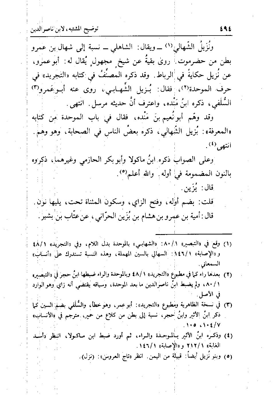 ونزيل الشهالي - وَيُقَال: الشاهلي - نِسْبَة إِلَى شهال بن عَمْرو بطن من حَضرمَوْت روى بَقِيَّة عَن شيخ مَجْهُول يُقَال لَهُ: أَبُو عَمْرو عَن نزيل حِكَايَة فِي الرِّبَاط وَقد ذكره المُصَنّف فِي كِتَابه التَّجْرِيد فِي حرف الْمُوَحدَة فَقَالَ: بزيل الشهابي روى عَنهُ أَبُو عَمْرو السلَفِي ذكره ابْن مَنْدَه واعترف أَن حَدِيثه مُرْسل انْتهى وَقد وهم أَبُو نعيم بن مَنْدَه فَقَالَ فِي بَاب الْمُوَحدَة من كِتَابه الْمعرفَة: بزيل الشهالي ذكره بعض النَّاس فِي الصَّحَابَة وَهُوَ وهم انْتهى وعَلى الصَّوَاب ذكره ابْن مَاكُولَا وَأَبُو بكر الْحَازِمِي وَغَيرهمَا ذَكرُوهُ بالنُّون المضمومة فِي أَوله وَالله أعلم قَالَ: بزين قلت: بِضَم اوله وَفتح الزَّاي وَسُكُون الْمُثَنَّاة تَحت يَليهَا نون قَالَ: أُميَّة بن عَمْرو بن هِشَام بن بزين الْحَرَّانِي عَن عتاب بن بشير.