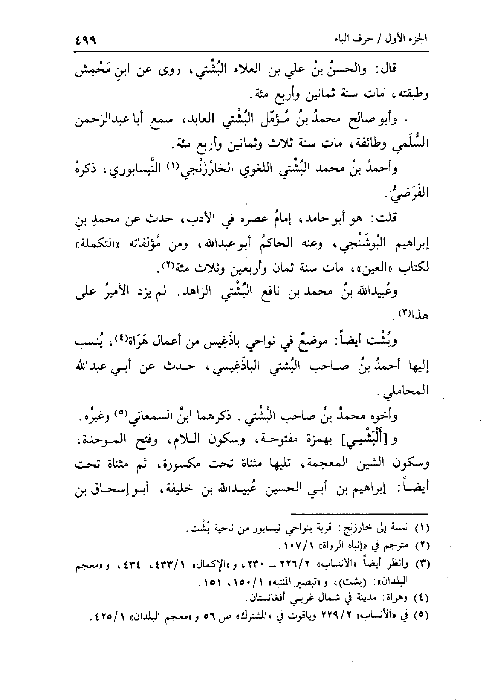 قَالَ: وَالْحسن بن عَليّ بن الْعَلَاء البشتي روى عَن ابْن محمش وطبقته مَاتَ سنة ثَمَانِينَ وَأَرْبع مئة وَأَبُو صَالح مُحَمَّد بن مُؤَمل البشتي العابد سمع أَبَا عبد الرَّحْمَن السّلمِيّ وَطَائِفَة مَاتَ سنة ثَلَاث وَثَمَانِينَ وَأَرْبع مئة وَاحْمَدْ بن مُحَمَّد البشتي اللّغَوِيّ الخارزنجي النَّيْسَابُورِي ذكره الفرضي قلت: هُوَ أَبُو حَامِد إِمَام عصره فِي الادب حدث عَن مُحَمَّد بن إِبْرَاهِيم البوشنجي وَعنهُ الْحَاكِم أَبُو عبد الله وَمن مؤلفاته التكملة لكتاب الْعين مَاتَ سنة ثَمَان واربعين وَثَلَاث مئة وَعبيد الله بن مُحَمَّد بن نَافِع البشتي الزَّاهِد لم يزدْ الْأَمِير على هَذَا وبشت أَيْضا: مَوضِع فِي نواحي باذغيس من أَعمال هراة ينْسب إِلَيْهَا أَحْمد بن صَاحب البشتي الباذغيسي حدث عَن أبي عبد الله الْمحَامِلِي وَأَخُوهُ مُحَمَّد بن صَاحب البشتي ذكرهمَا ابْن السَّمْعَانِيّ وَغَيره و [ألبشيي] بِهَمْزَة مَفْتُوحَة وَسُكُون اللَّام وَفتح الْمُوَحدَة وَسُكُون الشين الْمُعْجَمَة تَلِيهَا مثناة تَحت مَكْسُورَة ثمَّ مثناة تَحت أَيْضا: إِبْرَاهِيم بن أبي الْحُسَيْن عبيد الله بن خَليفَة أَبُو إِسْحَاق بن