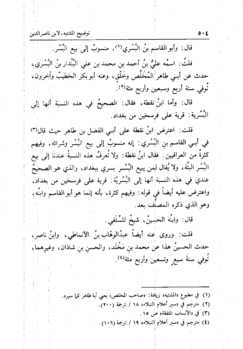 قَالَ: وَأَبُو الْقَاسِم بن البسري مَنْسُوب إِلَى بيع الْبُسْر قلت: اسْمه عَليّ بن أَحْمد بن مُحَمَّد بن عَليّ البندار بن البسري حدث عَن أبي طَاهِر المخلص وَخلق وَعنهُ أَبُو بكر الْخَطِيب وَآخَرُونَ توفّي سنة أَربع وَسبعين وَأَرْبع مئة قَالَ: واما ابْن نقطة فَقَالَ: الصَّحِيح فِي هَذِه النِّسْبَة انها إِلَى البسرية: قَرْيَة على فرسخين من بَغْدَاد قلت: اعْترض ابْن نقطة على أبي الْفضل بن طَاهِر حَيْثُ قَالَ فِي أبي الْقَاسِم بن البسري: إِنَّه مَنْسُوب إِلَى بيع الْبُسْر وشرائه وَفِيهِمْ كَثْرَة من الْعِرَاقِيّين فَقَالَ ابْن نقطة: وَلَا تعرف هَذِه النِّسْبَة عندنَا إِلَى بيع الْبُسْر الْبَتَّةَ وَلَا يُقَال لمن يَبِيع الْبُسْر بسري بِبَغْدَاد وَالَّذِي هُوَ الصَّحِيح عِنْدِي فِي هَذِه النِّسْبَة أَنَّهَا إِلَى البسرية: قَرْيَة عل فرسخين من بَغْدَاد وَاعْترض عَلَيْهِ أَيْضا فِي قَوْله: وَفِيهِمْ كَثْرَة بِأَنَّهُ إِنَّمَا هُوَ أَبُو الْقَاسِم وَابْنه وَهُوَ الَّذِي ذكره المُصَنّف بعد قَالَ: وَابْنه الْحُسَيْن شيخ للسلفي قَالَ: وروى عَنهُ أَيْضا عبد الْوَهَّاب بن الانماطي وَابْن نَاصِر حدث الْحُسَيْن هَذَا عَن مُحَمَّد بن مخلد وَالْحسن بن شَاذان وَغَيرهمَا توفّي سنة سبع وَتِسْعين وَأَرْبع مئة.