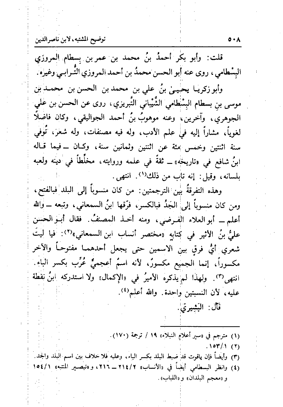 قلت: وَأَبُو بكر أَحْمد بن مُحَمَّد بن عمر بن بسطَام الْمروزِي البسطامي روى عَنهُ أَبُو الْحسن مُحَمَّد بن أَحْمد الْمروزِي الترابي وَغَيره وَأَبُو زَكَرِيَّا يحيى بن عَليّ بن مُحَمَّد بن الْحسن بن مُحَمَّد بن مُوسَى بن بسطَام البسطامي الشَّيْبَانِيّ التبريزي روى عَن الْحسن بن عَليّ الْجَوْهَرِي وَآخَرين وَعنهُ موهوب بن احْمَد الجوليقي وَكَانَ فَاضلا لغويا مشارا إِلَيْهِ فِي علم الادب وَله فِيهِ مصنفات وَله شعر توفّي سنة اثْنَتَيْنِ وَخمْس مئة عَن اثْنَتَيْنِ وَثَمَانِينَ سنة وَكَانَ - فِيمَا قَالَه ابْن شَافِع فِي تَارِيخه - ثِقَة فِي علمه وَرِوَايَته مخلطا فِي دينه ولعبه بِلِسَانِهِ وَقيل: إِنَّه تَابَ من ذَلِك انْتهى وَهَذِه التَّفْرِقَة بَين الترجمتين: من كَانَ مَنْسُوبا إِلَى الْبَلَد فبالفتح وَمن كَانَ مَنْسُوبا إِلَى الْجد فبالكسر فرقها ابْن السَّمْعَانِيّ وَتَبعهُ - وَالله اعْلَم - أَبُو الْعَلَاء الفرضي وَمِنْه أَخذ المُصَنّف فَقَالَ أَبُو الْحسن عَليّ بن الاثير فِي كِتَابه مُخْتَصر انساب ابْن السَّمْعَانِيّ: فيا لَيْث شعري أَي فرق بَين الاسمين حَتَّى يَجْعَل أَحدهمَا مَفْتُوحًا وَالْآخر مكسورا إِنَّمَا الْجَمِيع مَكْسُورَة لِأَنَّهُ اسْم اعجمي عرب بِكَسْر الْبَاء انْتهى وَلِهَذَا لم يذكرهُ الْأَمِير فِي الْإِكْمَال وَلَا استدركه ابْن نقطة عَلَيْهِ لِأَن النسبتين وَاحِدَة وَالله أعلم قَالَ: البشيري.