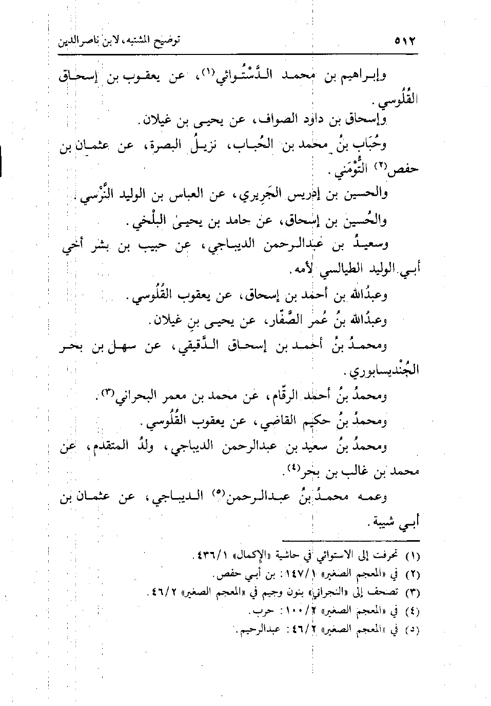 وَإِبْرَاهِيم بن مُحَمَّد الدستوَائي عَن يَعْقُوب بن إِسْحَاق القلوسي وَإِسْحَاق بن دَاوُد الصَّواف عَن يحيى بن غيلَان وحباب بن مُحَمَّد بن الْحباب نزيل الْبَصْرَة عَن عُثْمَان بن حَفْص التومني وَالْحُسَيْن بن إِدْرِيس الْجريرِي عَن الْعَبَّاس بن الْوَلِيد النَّرْسِي وَالْحُسَيْن بن إِسْحَاق عَن حَامِد بن يحيى الْبَلْخِي وَسَعِيد بن عبد الرَّحْمَن الديباجي عَن حبيب بن بشر أخي أبي الْوَلِيد الطَّيَالِسِيّ لأمه وَعبد الله بن أَحْمد بن اسحاق عَن يَعْقُوب القلوسي وَعبد الله بن عمر الصفار عَن يحيى بن غيلَان وَمُحَمّد بن أَحْمد بن إِسْحَاق الدقيقي عَن سهل بن بَحر الجنديسابوري وَمُحَمّد بن أَحْمد الرقام عَن مُحَمَّد بن معمر البحراني وَمُحَمّد بن حَكِيم القَاضِي عَن يَعْقُوب القلوسي وَمُحَمّد بن سعيد بن عبد الرَّحْمَن الديباجي ولد الْمُتَقَدّم عَن مُحَمَّد بن غَالب بن نحر وَعَمه مُحَمَّد بن عبد الرَّحْمَن الديباجي عَن عُثْمَان بن أبي شيبَة.