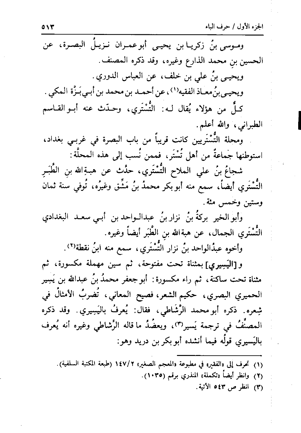 ومُوسَى بن زَكَرِيَّا بن يحيى أَبُو عمرَان نزيل الْبَصْرَة عَن الْحُسَيْن بن مُحَمَّد الذِّرَاع وَغَيره وَقد ذكره المُصَنّف وَيحيى بن عَليّ بن خلف عَن الْعَبَّاس الدوري وَيحيى بن معَاذ الْفَقِيه عَن أَحْمد بن مُحَمَّد بن أبي بزَّة الْمَكِّيّ كل من هَؤُلَاءِ يُقَال لَهُ: التسترِي وَحدث عَنهُ أَبُو الْقَاسِم الطَّبَرَانِيّ وَالله أعلم ومحلة التستريين كَانَت قَرِيبا من بَاب الْبَصْرَة فِي غربي بَغْدَاد استوطنها جمَاعَة من أهل تستر فَمِمَّنْ نسب إِلَى هَذِه الْمحلة: شُجَاع بن عَليّ الملاح التسترِي حدث عَن هبة الله بن الطبر التسترِي ايضا سمع مِنْهُ أَبُو بكر مُحَمَّد بن مشق وَغَيره توفّي سنة ثَمَان وَسِتِّينَ وَخمْس مئة وَأَبُو الْخَيْر بركَة بن نزال بن عبد الْوَاحِد بن أبي سعد الْبَغْدَادِيّ التسترِي الْجمال عَن هبة الله بن الطبر أَيْضا وَغَيره واخوه عبد الْوَاحِد بن نزار التسترِي سمع مِنْهُ ابْن نقطة و [اليسيري] بمثناة تَحت مَفْتُوحَة ثمَّ سين مُهْملَة مَكْسُورَة ثمَّ مثناة تَحت سَاكِنة ثمَّ رَاء مَكْسُورَة: أَبُو جَعْفَر مُحَمَّد بن عبد الله بن يسير الْحِمْيَرِي الْبَصْرِيّ حَكِيم الشّعْر فصيح الْمعَانِي تضرب الامثال فِي شعره ذكره أَبُو مُحَمَّد الرشاطي فَقَالَ: يعرف باليسيري وَقد ذكره المُصَنّف فِي تَرْجَمَة يسير ويعضد مَا قَالَه الرشاطي وَغَيره انه يعرف باليسيري قَوْله فِيمَا أنْشدهُ أَبُو بكر بن دُرَيْد وَهُوَ: