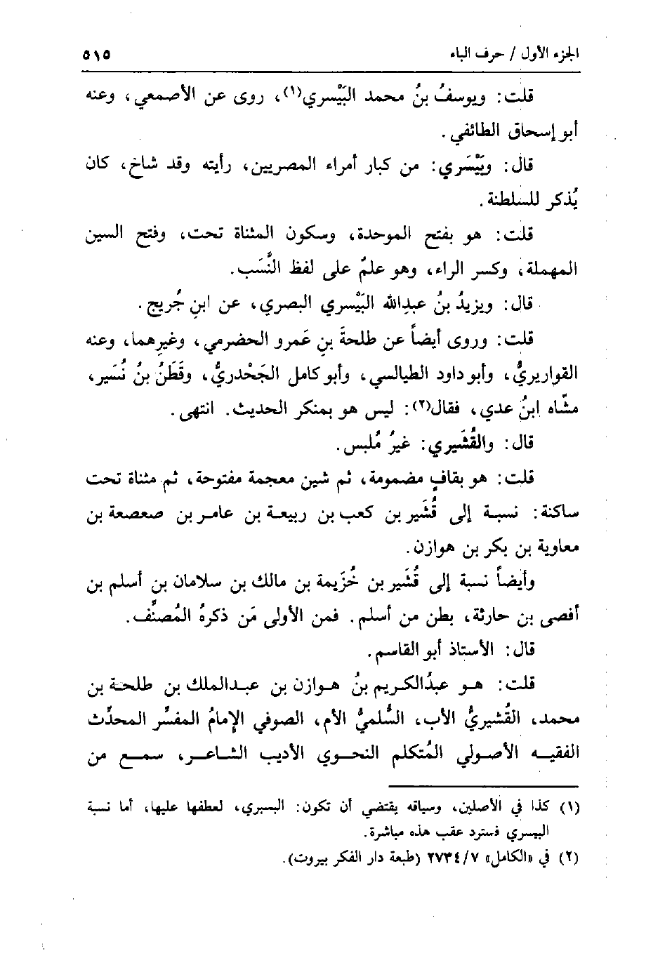 قلت: ويوسف بن مُحَمَّد البيسري روى عَن الاصمعي وَعنهُ أَبُو إِسْحَاق الطَّائِفِي قَالَ: وييسري: من كبار أُمَرَاء المصريين رَأَيْته وَقد شاخ كَانَ يذكر للسلطنة. قلت: هُوَ بِفَتْح الْمُوَحدَة وَسُكُون الْمُثَنَّاة تَحت وَفتح السِّين الْمُهْملَة وَكسر الرَّاء وَهُوَ علم على لفظ النّسَب قَالَ: وَيزِيد بن عبد الله البيسري الْبَصْرِيّ عَن ابْن جريج قلت: وروى أَيْضا عَن طَلْحَة بن عَمْرو الْحَضْرَمِيّ وَغَيرهمَا وَعنهُ القواريري وَأَبُو دَاوُد الطَّيَالِسِيّ وَأَبُو كَامِل الجحدري وقطن بن نسير مَشاهُ ابْن عدي فَقَالَ: لَيْسَ هُوَ بمنكر الحَدِيث انْتهى قَالَ: والقشيري: غير ملبس قلت: هُوَ بقاف مَضْمُومَة ثمَّ شين مُعْجمَة مَفْتُوحَة ثمَّ مثناة تَحت سَاكِنة: نِسْبَة إِلَى قُشَيْر بن كَعْب بن ربيعَة بن عَامر بن صعصعة بن مُعَاوِيَة بن بكر بن هوَازن وَأَيْضًا نِسْبَة إِلَى قُشَيْر بن خُزَيْمَة بن مَالك بن سلامان بن اسْلَمْ بن افصى بن حَارِثَة بطن من اسْلَمْ فَمن الأولى من ذكره المُصَنّف قَالَ: الْأُسْتَاذ أَبُو الْقَاسِم قلت: هُوَ عبد الْكَرِيم بن هوَازن بن عبد الْملك بن طَلْحَة بن مُحَمَّد الْقشيرِي الاب السّلمِيّ الام الصُّوفِي الإِمَام الْمُفَسّر الْمُحدث الْفَقِيه الاصولي الْمُتَكَلّم النَّحْوِيّ الأديب الشَّاعِر سمع من
