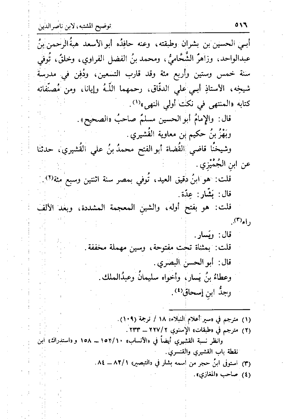 أبي الْحُسَيْن بن بَشرَان وطبقته وَعنهُ حافده أَبُو الاسعد هبة الرَّحْمَن بن عبد الْوَاحِد وزاهر الشحامي وَمُحَمّد بن الْفضل الفراوي وَخلق توفّي سنة خمس وَسِتِّينَ وَأَرْبع مئة وَقد قَارب التسعين وَدفن فِي مدرسة شَيْخه الْأُسْتَاذ أبي عَليّ الدقاق رحمهمَا الله وإيانا وَمن مصنفاته كِتَابه الْمُنْتَهى فِي نكت اولي النَّهْي قَالَ: وَالْإِمَام أَبُو الْحُسَيْن مُسلم صَاحب الصَّحِيح وبهز بن حَكِيم بن مُعَاوِيَة الْقشيرِي وَشَيخنَا قَاضِي الْقُضَاة أَبُو الْفَتْح مُحَمَّد بن عَليّ الْقشيرِي حَدثنَا عَن ابْن الجميزي قلت: هُوَ ابْن دَقِيق الْعِيد توفّي بِمصْر سنة اثْنَتَيْنِ وَسبع مئة قَالَ: بشار: عدَّة قلت: هُوَ بِفَتْح اوله والشين الْمُعْجَمَة الْمُشَدّدَة وَبعد الالف رَاء قَالَ: ويسار قَالَ: بمثناة تَحت مَفْتُوحَة وسين مُهْملَة مُخَفّفَة قَالَ: أَبُو الْحسن الْبَصْرِيّ وَعَطَاء بن يسَار وأخواه سُلَيْمَان وَعبد الْملك وجد ابْن إِسْحَاق.