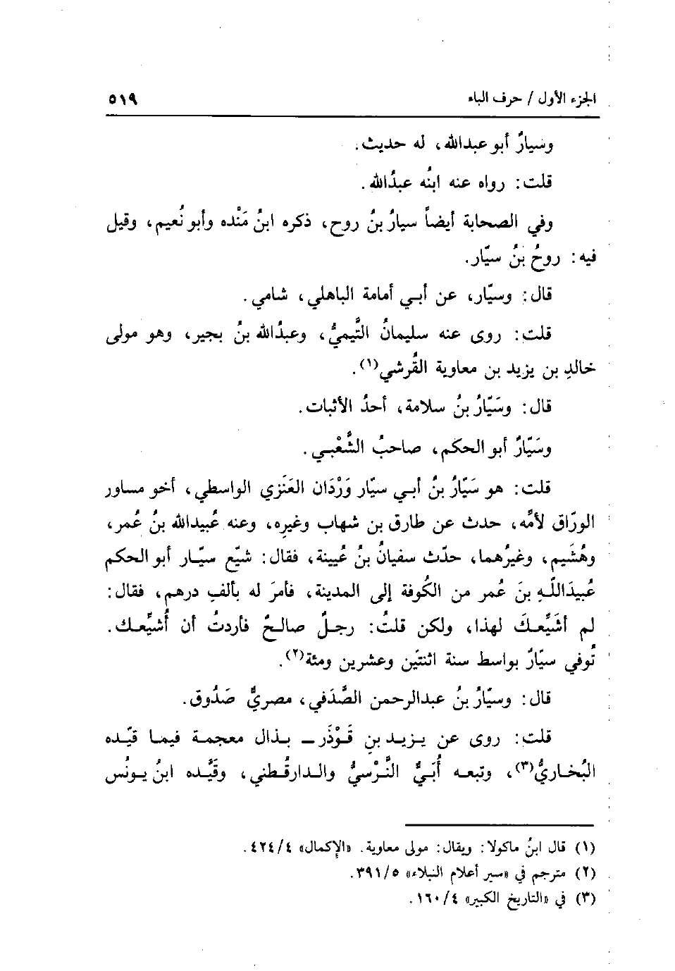 وسيار أَبُو عبد الله لَهُ حَدِيث قلت: رَوَاهُ عَنهُ ابْنه عبد الله. وَفِي الصَّحَابَة أَيْضا سيار بن روح ذكره ابْن مَنْدَه وابراهيم وَقيل فِيهِ: روح بن سيار. قَالَ: وسيار عَن أبي امامة الْبَاهِلِيّ شَامي قلت: روى عَنهُ سُلَيْمَان التَّيْمِيّ وَعبد الله بن بجير وَهُوَ مولى خَالِد بن يزِيد بن مُعَاوِيَة الْقرشِي قَالَ: وسيار بن سَلامَة أحد الْإِثْبَات وسيار أَبُو الحكم صَاحب الشّعبِيّ قلت: هُوَ سيار بن أبي سيار وردان الْعَنزي الوَاسِطِيّ أَخُو مساور الْوراق لأمه حدث عَن طَارق بن شهَاب وَغَيره وَعنهُ عبيد الله بن عمر وهشيم وَغَيرهمَا حدث سُفْيَان بن عُيَيْنَة فَقَالَ: شيع سيار أَبُو الحكم عبيد الله بن عمر من الْكُوفَة إِلَى الْمَدِينَة فَأمر بِأَلف دِرْهَم فَقَالَ: لم اشيعك لهَذَا وَلَكِن قلت: رجل صَالح فاردت أَن اشيعك توفّي سيار بواسط سنة اثْنَتَيْنِ وَعشْرين ومئة قَالَ: وسيار بن عبد الرَّحْمَن الصَّدَفِي مصري صَدُوق قلت: روى عَن يزِيد بن قوذر - بذال مُعْجمَة فِيمَا قَيده البُخَارِيّ وَتَبعهُ أبي النَّرْسِي وَالدَّارَقُطْنِيّ وَقَيده ابْن يُونُس