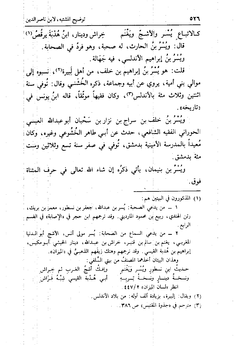 قَالَ: وَيسر بن الْحَارِث لَهُ صُحْبَة وَهُوَ فَرد فِي الصَّحَابَة وَيسر بن إِبْرَاهِيم الاندلسي فِيهِ جَهَالَة قلت: هُوَ يسر بن إِبْرَاهِيم بن خلف من أهل لبيرة نسبوه إِلَى موَالِي بن امية يروي عَن أَبِيه وَجَمَاعَة ذكره الْخُشَنِي وَقَالَ: توفّي سنة اثْنَتَيْنِ وَثَلَاث مئة بالاندلس وَكَانَ فَقِيها موثقًا قَالَه ابْن يُونُس فِي تَارِيخه وَيسر بن خلف بن سراج بن نزار بن سحبان أَبُو عبد الله الْعَبْسِي الحوراني الْفَقِيه الشَّافِعِي حدث عَن أبي طَاهِر الخشوعي وَغَيره وَكَانَ معيدا بِالْمَدْرَسَةِ الامينية بِدِمَشْق توفّي فِي صفر سنة تسع وَثَلَاثِينَ وست مئة بِدِمَشْق وَيسر بن بنيمان يَأْتِي ذكره أَن شَاءَ الله تَعَالَى فِي حرف الْمُثَنَّاة فَوق.