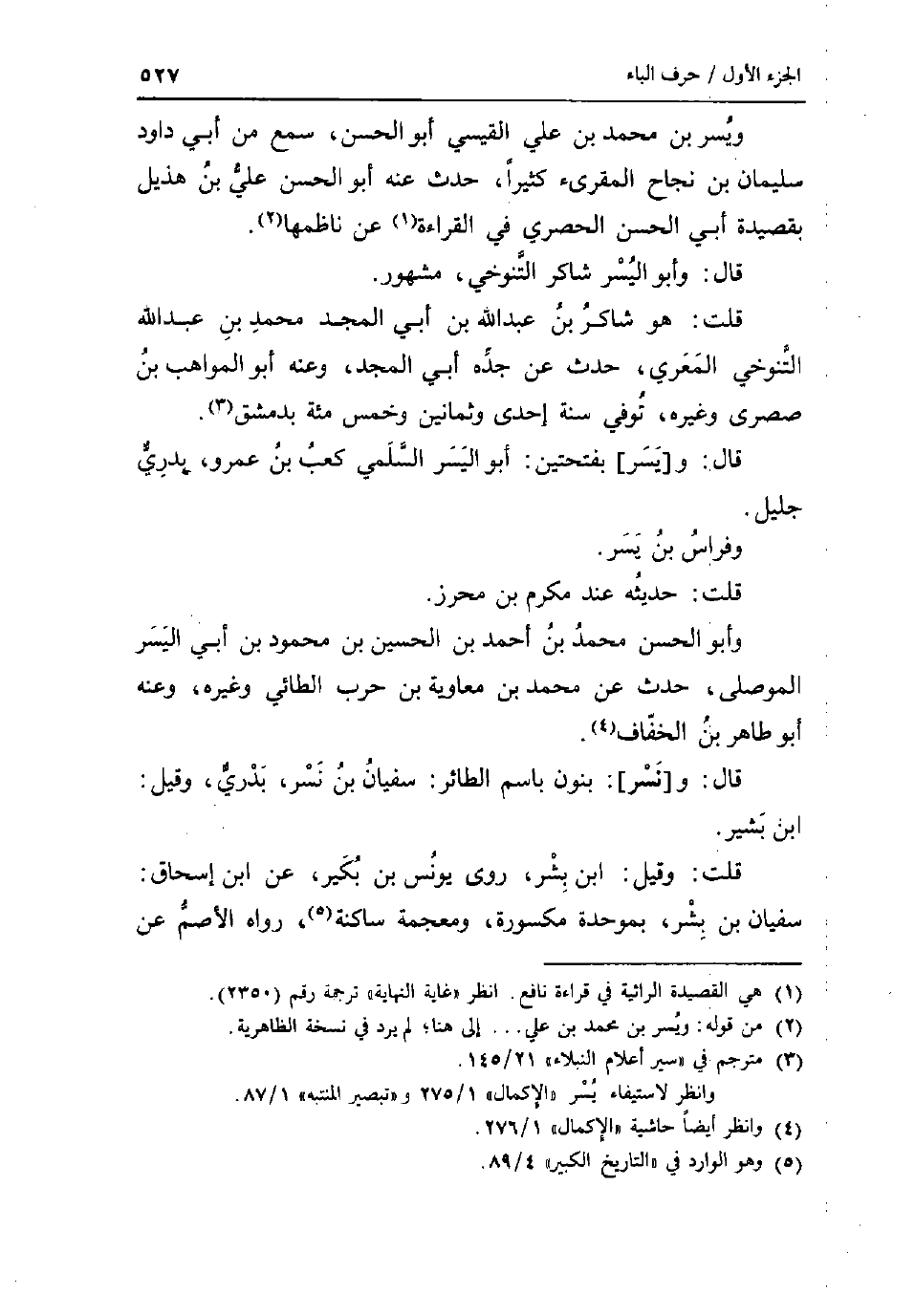 وَيسر بن مُحَمَّد بن عَليّ الْقَيْسِي أَبُو الْحسن سمع من أبي دَاوُد سُلَيْمَان بن نجاح الْمُقْرِئ كثيرا حدث عَنهُ أَبُو الْحسن عَليّ بن هُذَيْل بقصيدة أبي الْحسن الحصري فِي الْقِرَاءَة عَن ناظمها قَالَ: وَأَبُو الْيُسْر شَاكر التنوخي مَشْهُور قلت: هُوَ شَاكر بن عبد الله بن أبي الْمجد مُحَمَّد بن عبد الله التنوخي المعري حدث عَن جده أبي الْمجد وَعنهُ أَبُو الْمَوَاهِب بن التنوخي المعري حدث عَن جده أبي الْمجد وَعنهُ أَبُو الْمَوَاهِب بن صصرى وَغَيره توفّي سنة إِحْدَى وَثَمَانِينَ وَخمْس مئة بِدِمَشْق قَالَ: و [يسر] بِفتْحَتَيْنِ: أَبُو الْيُسْر السّلمِيّ كَعْب بن عَمْرو بَدْرِي جليل وفراس بن يسر قلت: حَدِيثه عِنْد مكرم بن مُحرز وَأَبُو الْحسن مُحَمَّد بن أَحْمد بن الْحُسَيْن بن مَحْمُود بن أبي الْيُسْر الْموصِلِي حدث عَن مُحَمَّد بن مُعَاوِيَة بن حَرْب الطَّائِي وَغَيره وَعنهُ أَبُو طَاهِر بن الْخفاف قَالَ: و [نسر] : بنُون باسم الطَّائِر: سُفْيَان بن نسر بَدْرِي وَقيل: ابْن بشير قلت: وَقيل: ابْن بشر روى يُونُس بن بكير عَن ابْن إِسْحَاق: سُفْيَان بن بشر بموحدة مَكْسُورَة ومعجمة سَاكِنة رَوَاهُ الْأَصَم عَن