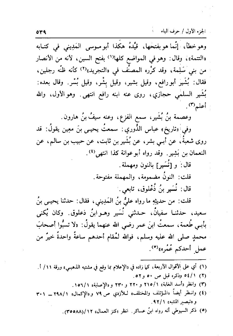 وَهُوَ خطأ إِنَّمَا هُوَ بِفَتْحِهَا قَيده هَكَذَا أَبُو مُوسَى الْمَدِينِيّ فِي كِتَابه التَّتِمَّة وَقَالَ: وَهُوَ فِي الْمَوَاضِع كلهَا بِفَتْح السِّين لِأَنَّهُ من الْأَنْصَار من بني سَلمَة وَقد كَرَّرَه المُصَنّف فِي التَّجْرِيد كَأَنَّهُ ظَنّه رجلَيْنِ فَقَالَ: بشير أَبُو رَافع وَقيل بشير وَقيل بشر وَقيل بسر وَقَالَ بعده: بشير السّلمِيّ حجازي روى عَنهُ ابْنه رَافع انْتهى وَهُوَ الأول وَالله أعلم وعصمة بن بشير سمع الْفَزع وَعنهُ سيف بن هَارُون وَفِي تَارِيخ عَبَّاس الدوري: سَمِعت يحيى بن معِين يَقُول: قد روى شُعْبَة عَن ابْن بشر عَن بشير بن ثَابت عَن حبيب بن سَالم عَن النُّعْمَان بن بشير وَقد رَوَاهُ أَبُو عوَانَة كَذَا انْتهى قَالَ: و [نسير] بالنُّون ومهملة قلت: النُّون مَضْمُومَة والمهملة مَفْتُوحَة قالك نسير بن ذعلوق تَابِعِيّ قلت: من حَدِيثه مَا رَوَاهُ عَليّ بن الْمَدِينِيّ فَقَالَ: حَدثنَا يحيى بن سعيد حَدثنَا سُفْيَان حَدثنِي نسير وَهُوَ ابْن ذعلوق وَكَانَ يكنى بَابي طعمة سَمِعت ابْن عمر رَضِي الله عَنْهُمَا يَقُول: لَا تسبوا أَصْحَاب مُحَمَّد صلى الله عَلَيْهِ وَسلم فوَاللَّه لمقام أحدهم سَاعَة وَاحِدَة خير من عمل أحدكُم عمره.