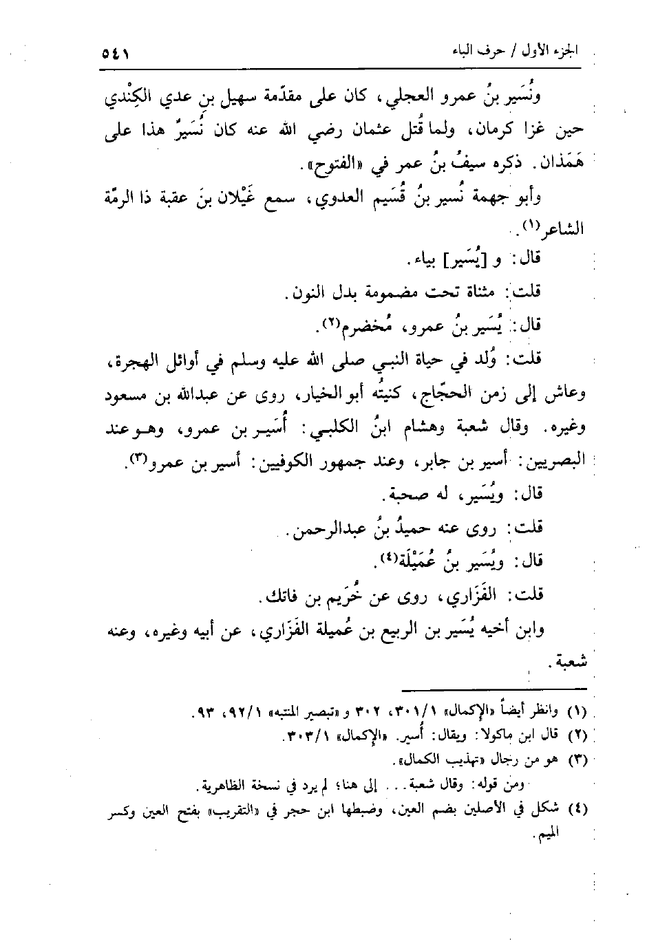 ونسير بن عَمْرو الْعجلِيّ كَانَ على مُقَدّمَة سُهَيْل بن عدي الْكِنْدِيّ حِين غزا كرمان وَلما قتل عُثْمَان رَضِي الله عَنهُ كَانَ نسير هَذَا على همذان ذكره سيف بن عمر فِي الْفتُوح وَأَبُو جهمة نسير بن قسيم الْعَدوي سمع غيلَان بن عقبَة ذَا الرمة الشَّاعِر قَالَ: و [يسير] بياء قلت: مثناة تَحت مَضْمُومَة بدل النُّون قَالَ: يسير بن عَمْرو مخضرم قلت: ولد فِي حَيَاة النَّبِي صلى الله عَلَيْهِ وَسلم فِي أَوَائِل الْهِجْرَة وعاش إِلَى زمن الْحجَّاج كنيته أَبُو الْخِيَار روى عَن عبد الله بن مَسْعُود وَغَيره وَقَالَ شُعْبَة وَهِشَام ابْن الْكَلْبِيّ: اسير بن عَمْرو وَهُوَ عِنْد الْبَصرِيين: اسير بن جَابر وَعند جُمْهُور الْكُوفِيّين: اسير بن عَمْرو قَالَ: ويسير لَهُ صُحْبَة قلت: روى عَنهُ حميد بن عبد الرَّحْمَن قَالَ: ويسير بن عميلة قلت: الْفَزارِيّ روى عَن خريم بن فاتك وَابْن أَخِيه يسير بن الرّبيع بن عميلة الْفَزارِيّ عَن أَبِيه وَغَيره وَعنهُ شُعْبَة.