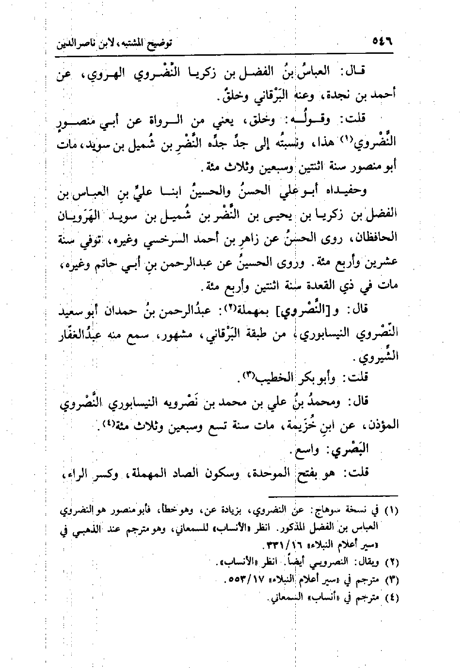 قَالَ: الْعَبَّاس بن الْفضل بن زَكَرِيَّا النضروي الْهَرَوِيّ عَن أَحْمد بن نجدة وَعنهُ البرقاني وَخلق قلت: وَقَوله: وَخلق يَعْنِي من الروَاة عَن أبي مَنْصُور النضروي هَذَا ونسبته إِلَى جد جده النَّضر بن شُمَيْل بن سُوَيْد مَاتَ أَبُو مَنْصُور سنة اثْنَتَيْنِ وَسبعين وَثَلَاث مئة وحفيداه أَبُو عَليّ الْحسن وَالْحُسَيْن ابْنا عَليّ بن الْعَبَّاس بن الْفضل بن زَكَرِيَّا بن يحيى بن النَّضر بن شُمَيْل بن سُوَيْد الهرويان الحافظان روى الْحسن عَن زَاهِر بن أَحْمد السَّرخسِيّ وَغَيره توفّي سنة عشْرين وَأَرْبع مئة وروى الْحُسَيْن عَن عبد الرَّحْمَن بن أبي حَاتِم وَغَيره مَاتَ فِي ذِي الْقعدَة سنة اثْنَتَيْنِ وَأَرْبع مئة قَالَ: و [النصروي] بِمُهْملَة: عبد الرَّحْمَن بن حمدَان أَبُو سعيد النصروي النَّيْسَابُورِي من طبقَة البرقاني مَشْهُور سمع مِنْهُ عبد الْغفار الشيروي قلت: وَأَبُو بكر الْخَطِيب قَالَ: وَمُحَمّد بن عَليّ بن مُحَمَّد بن نصرويه النَّيْسَابُورِي النصروي الْمُؤَذّن عَن ابْن خُزَيْمَة مَاتَ سنة تسع وَسبعين وَثَلَاث مئة الْبَصْرِيّ: وَاسع قلت: هُوَ بِفَتْح الْمُوَحدَة وَسُكُون الصَّاد الْمُهْملَة وَكسر الرَّاء