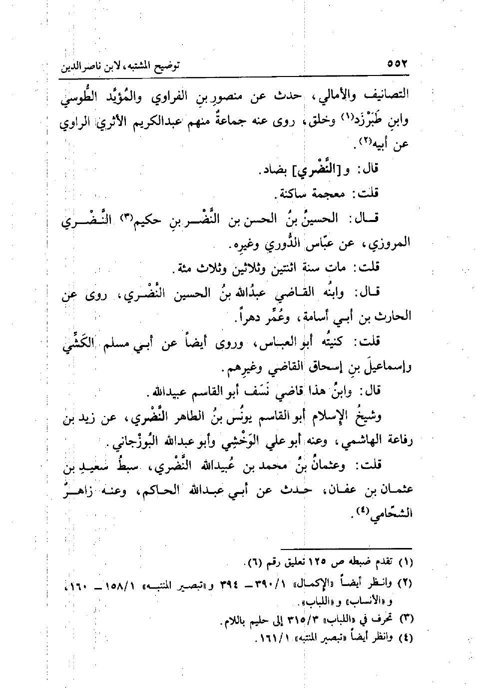 التصانيف والأمالي حدث عَن مَنْصُور بن الفراوي والمؤيد الطوسي وَابْن طبرزد وَخلق روى عَنهُ جمَاعَة مِنْهُم عبد الْكَرِيم الأثري الرَّاوِي عَن أَبِيه قَالَ: و [النضري] بضاد قلت: مُعْجمَة سَاكِنة قَالَ: الْحُسَيْن بن الْحسن بن النَّضر بن حَكِيم النضري الْمروزِي عَن عَبَّاس الدوري وَغَيره قلت: مَاتَ سنة اثْنَتَيْنِ وَثَلَاثِينَ وَثَلَاث مئة قَالَ: وَابْنه القَاضِي عبد الله بن الْحُسَيْن النضري روى عَن الْحَارِث بن أبي اسامة وَعمر دهرا قلت: كنيته أَبُو الْعَبَّاس وروى أَيْضا عَن أبي مُسلم الْكشِّي وَإِسْمَاعِيل بن إِسْحَاق القَاضِي وَغَيرهم قَالَ: وَابْن هَذَا قَاضِي نسف أَبُو الْقَاسِم عبيد الله وَشَيخ الْإِسْلَام أَبُو الْقَاسِم يُونُس بن الطَّاهِر النضري عَن زيد بن رِفَاعَة الْهَاشِمِي وَعنهُ أَبُو عَليّ الوخشي وَأَبُو عبد الله البوزجاني قلت: وَعُثْمَان بن مُحَمَّد بن عبيد الله النضري سبط سعيد بن عُثْمَان بن عَفَّان حدث عَن أبي عبد الله الْحَاكِم وَعنهُ زَاهِر الشحامي.