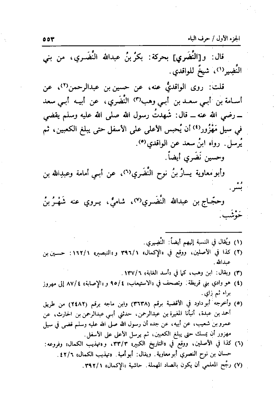 قَالَ: و [النضري] بحركة: بكر بن عبد الله النضري من بني النَّضِير شيخ لِلْوَاقِدِي قلت: روى الْوَاقِدِيّ عَنهُ عَن حُسَيْن بن عبد الرَّحْمَن عَن أُسَامَة بن أبي سعد بن أبي وهب النضري عَن أَبِيه أبي سعد - رَضِي الله عَنهُ - قَالَ: شهِدت رَسُول الله صلى الله عَلَيْهِ وَسلم يقْضِي فِي سيل مهزور أَن يحبس الْأَعْلَى على الْأَسْفَل حَتَّى يبلغ الْكَعْبَيْنِ ثمَّ يُرْسل رَوَاهُ ابْن سعد عَن الْوَاقِدِيّ وحسين نضري أَيْضا وَأَبُو مُعَاوِيَة يسَار بن نوح النضري عَن أبي امامة وَعبد الله بن بسر وحجاج بن عبد الله النضري شَامي يروي عَنهُ شهر بن حَوْشَب.