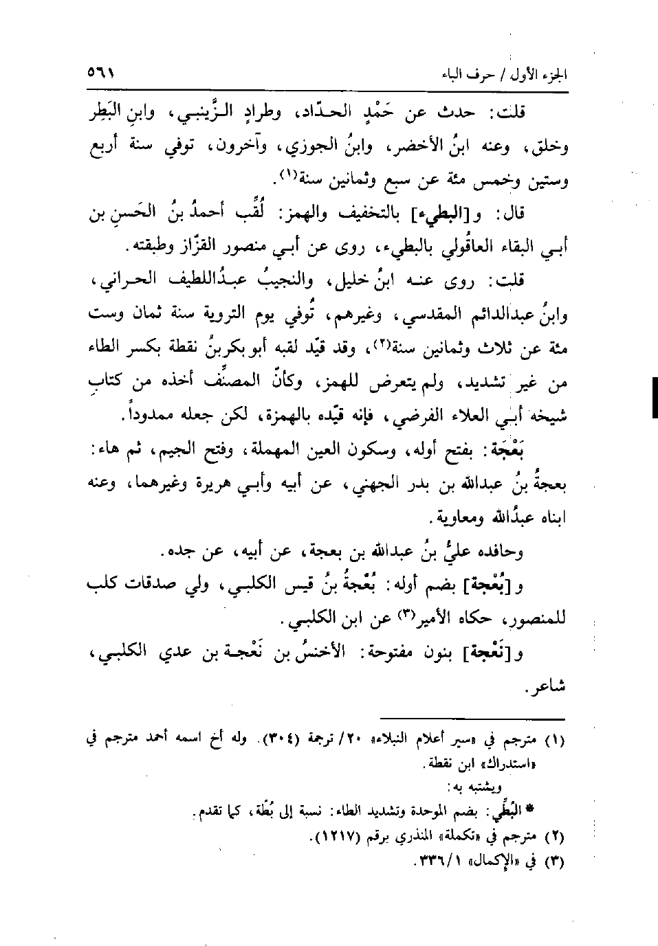 قلت: حدث عَن حمد الْحداد وطراد الزَّيْنَبِي وَابْن البطر وَخلق وَعنهُ ابْن الاخضر وَابْن الْجَوْزِيّ وَآخَرُونَ توفّي سنة أَربع وَسِتِّينَ وَخمْس مئة عَن سبع وَثَمَانِينَ سنة قَالَ: و [البطيء] بِالتَّخْفِيفِ والهمز: لقب أَحْمد بن الْحسن بن أبي الْبَقَاء العاقولي بالبطيء روى عَن أبي مَنْصُور الْقَزاز وطبقته قلت: روى عَنهُ ابْن خَلِيل والنجيب عبد اللَّطِيف الْحَرَّانِي وَابْن عبد الدَّائِم الْمَقْدِسِي وَغَيرهم توفّي يَوْم التَّرويَة سنة ثَمَان وست مئة عَن ثَلَاث وَثَمَانِينَ سنة وَقد قيد لقبه ابْن بكر بن نقطة بِكَسْر الطَّاء من غير تَشْدِيد وَلم يتَعَرَّض للهمز وَكَأن المُصَنّف أَخذه من كتاب شَيْخه أبي الْعَلَاء الفرضي فَإِنَّهُ قَيده بِالْهَمْزَةِ لَكِن جعله ممدودا بعجة: بِفَتْح أَوله وَسُكُون الْعين الْمُهْملَة وَفتح الْجِيم ثمَّ هَاء: بعجة بن عبد الله بن بدر الْجُهَنِيّ عَن أَبِيه وابي هُرَيْرَة وَغَيرهمَا وَعنهُ ابناه عبد الله وَمُعَاوِيَة وحافده عَليّ بن عبد الله بن بعجة عَن أَبِيه عَن جده و [بعجة] بِضَم أَوله: بعجة بن قيس الْكَلْبِيّ ولي صدقَات كلب للمنصور حَكَاهُ الْأَمِير عَن ابْن الْكَلْبِيّ و [نعجة] بنُون مَفْتُوحَة: الاخنس بن نعجة بن عدي الْكَلْبِيّ شَاعِر.