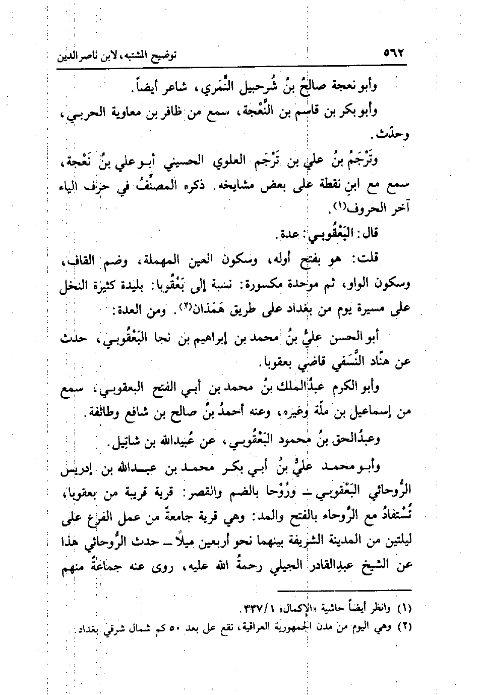 وَأَبُو نعجة صَالح بن شُرَحْبِيل النمري شَاعِر أَيْضا وَأَبُو بكر بن قَاسم بن النعجة سمع من ظافر بن مُعَاوِيَة الْحَرْبِيّ وَحدث وَترْجم بن عَليّ بن ترْجم الْعلوِي الْحُسَيْنِي أَبُو عَليّ بن نعجة سمع مَعَ ابْن نقطة على بعض مشايخه ذكره المُصَنّف فِي حرف الْيَاء آخر الْحُرُوف قَالَ: البعقوبي: عدَّة قلت: هُوَ بِفَتْح اوله وَسُكُون الْعين الْمُهْملَة وَضم الْقَاف وَسُكُون الْوَاو ثمَّ مُوَحدَة مَكْسُورَة: نِسْبَة إِلَى بعقوبا: بليدَة كَثِيرَة النّخل على مسيرَة يَوْم من بَغْدَاد على طَرِيق همذان وَمن الْعدة: أَبُو الْحسن عَليّ بن مُحَمَّد بن إِبْرَاهِيم بن نجا البعقوبي حدث عَن هناد السنفي قَاضِي بعقوبا وَأَبُو الْكَرم عبد الْملك بن مُحَمَّد بن أبي الْفَتْح البعقوبي سمع من إِسْمَاعِيل بن مِلَّة وَغَيره وَعنهُ أَحْمد بن صَالح بن شَافِع طَائِفَة وَعبد الْحق بن مَحْمُود البعقوبي عَن عبيد الله بن شاتيل وَأَبُو مُحَمَّد عَليّ بن أبي بكر مُحَمَّد بن عبد الله بن إِدْرِيس الروحائي البعقوبي - وروحا بِالضَّمِّ وَالْقصر: قَرْيَة قريبَة من بعقوبا تستفاد مَعَ الروحاء بِالْفَتْح وَالْمدّ: وَهِي قَرْيَة جَامِعَة من عمل الْفَرْع على لَيْلَتَيْنِ من الْمَدِينَة الشَّرِيفَة بَينهمَا نَحْو أَرْبَعِينَ ميلًا - حدث الروحائي هَذَا عَن الشَّيْخ عبد الْقَادِر الجيلي رَحْمَة الله عَلَيْهِ روى عَنهُ جمَاعَة مِنْهُم