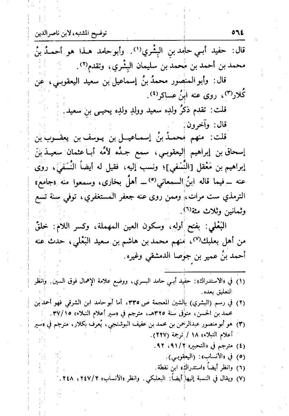 قَالَ: حفيد أبي حَامِد بن البشري وَأَبُو أَحْمد هَذَا هُوَ أَحْمد بن مُحَمَّد بن أَحْمد بن مُحَمَّد بن سُلَيْمَان البشري وَتقدم قَالَ: وَأَبُو الْمَنْصُور مُحَمَّد بن إِسْمَاعِيل بن سعيد اليعقوبي عَن كلار روى عَنهُ ابْن عَسَاكِر قلت: تقدم ذكر وَلَده سعيد وَولد وَلَده يحيى بن سعيد قَالَ: وَآخَرُونَ قلت: مِنْهُم مُحَمَّد بن إِسْمَاعِيل بن يُوسُف بن يَعْقُوب بن إِسْحَاق بن إِبْرَاهِيم اليعقوبي سمع جده لامه أَبَا عُثْمَان سعيد بن إِبْرَاهِيم بن معقل [النَّسَفِيّ] وَنسب إِلَيْهِ فَقيل لَهُ أَيْضا النَّسَفِيّ روى عَنهُ - فِيمَا قَالَه ابْن السَّمْعَانِيّ - أهل بُخَارى وسمعوا مِنْهُ جَامع التِّرْمِذِيّ سِتّ مَرَّات وَمِمَّنْ روى عَنهُ جَعْفَر المستغفري توفّي سنة تسع وَثَمَانِينَ وَثَلَاث مئة البعلي: بِفَتْح اوله وَسُكُون الْعين الْمُهْملَة وَكسر اللَّام: خلق من أهل بعلبك مِنْهُم مُحَمَّد بن هَاشم بن سعيد البعلي حدث عَنهُ أَحْمد بن عُمَيْر بن جوصا الدِّمَشْقِي وَغَيره.