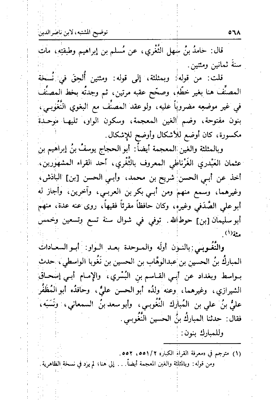 قَالَ: حَامِد بن سهل الثغفري عَن مُسلم بن إِبْرَاهِيم وطبقته مَاتَ سنة ثَمَانِينَ ومئتين قلت: من قَوْله: وبمثلثة إِلَى قَوْله: ومئتين ألحق فِي نُسْخَة المُصَنّف هُنَا بِغَيْر خطه وَصحح عقبه مرَّتَيْنِ ثمَّ وجدته بِخَط المُصَنّف فِي غير مَوْضِعه مَضْرُوبا عَلَيْهِ وَلَو عقد المُصَنّف مَعَ الْبَغَوِيّ النغوبي فِي غير مَوْضِعه مَضْرُوبا عَلَيْهِ وَلَو عقد المُصَنّف مَعَ الْبَغَوِيّ النغوبي بنُون مَفْتُوحَة وَضم الْغَيْن الْمُعْجَمَة وَسُكُون الْوَاو تَلِيهَا مُوَحدَة مَكْسُورَة كَانَ اوضع للأشكال وأوضح للإشكال وبالمثلثة والغين الْمُعْجَمَة أَيْضا: أَبُو الْحجَّاج يُوسُف بن إِبْرَاهِيم بن عُثْمَان الْعَبدَرِي الغرناطي الْمَعْرُوف بالثغري أحد الْقُرَّاء الْمَشْهُورين اخذ عَن أبي الْحسن شُرَيْح بن مُحَمَّد وابي الْحسن [بن] الباذش وَغَيرهمَا وَسمع مِنْهُم وَمن أبي بكر بن الْعَرَبِيّ وَآخَرين واجاز لَهُ وَغَيرهمَا وَسمع مِنْهُم وَمن أبي بكر بن الْعَرَبِيّ وَآخَرين واجاز لَهُ اب عَليّ الصَّدَفِي وَغَيره وَكَانَ حَافِظًا مقرئا فَقِيها روى عَنهُ عدَّة مِنْهُم أَبُو سُلَيْمَان [بن] حوط الله وَتُوفِّي فِي شَوَّال سنة تسع وَتِسْعين وَخمْس مئة والنغوبي: بالنُّون أَوله وَالْمُوَحَّدَة بعد الْوَاو: أَبُو السعادات الْمُبَارك بن الْحُسَيْن بن عبد الْوَهَّاب بن الْحُسَيْن بن نغوبا الوَاسِطِيّ حدث بواسط وبغداد عَن أبي الْقَاسِم بن البسري وَالْإِمَام أبي إِسْحَاق الشِّيرَازِيّ وَغَيرهمَا وَعنهُ وَلَده أَبُو الْحسن عَليّ وحافده أَبُو المظفر عَليّ بن عَليّ بن الْمُبَارك النغوبي وَأَبُو سعد بن السَّمْعَانِيّ وَنسبه وفقال: حَدثنَا الْمُبَارك بن الْحُسَيْن النغوبي وللمبارك بنُون: