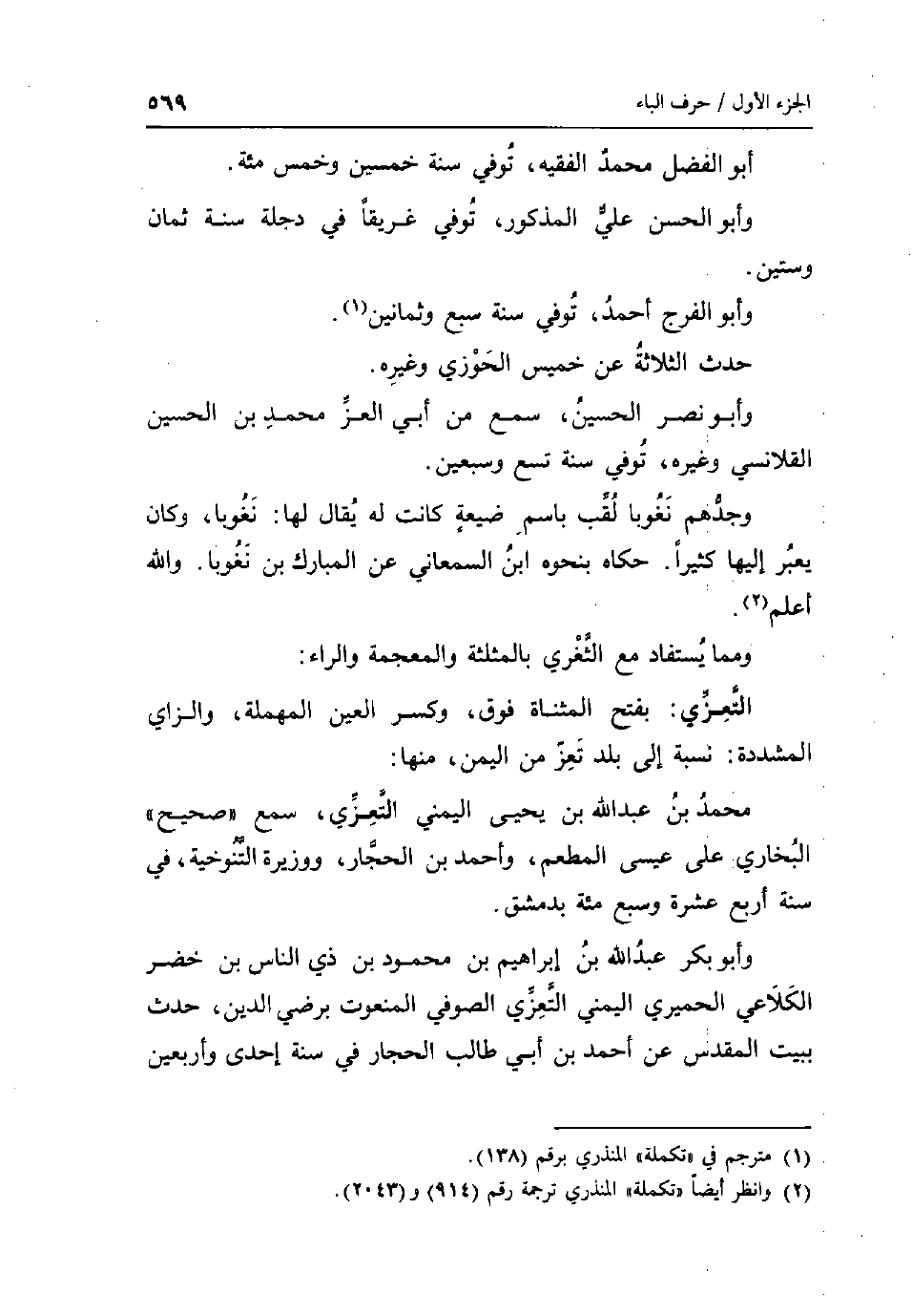 أَبُو الْفضل مُحَمَّد الفققيه توفّي سنة خمس وَخمْس مئة وَأَبُو الْحسن عَليّ الْمَذْكُور توفّي غريقا فِي دجلة سنة ثَمَان وَسِتِّينَ وَأَبُو الْفرج أَحْمد توفّي سنة سبع وَثَمَانِينَ حدث الثَّلَاثَة عَن خَمِيس الْحَوْزِيِّ وَغَيره وَأَبُو نصر الْحُسَيْن سمع من أبي الْعِزّ مُحَمَّد بن الْحُسَيْن القلانسي وَغَيره توفّي سنة تسع وَسبعين وجدهم نغوبا لقب باسم ضَيْعَة كَانَت لَهُ يُقَال لَهَا: نغويا وَكَانَ يعبر إِلَيْهَا كثيرا حَكَاهُ بِنَحْوِهِ ابْن السَّمْعَانِيّ عَن الْمُبَارك بن نغوبا وَالله أعلم وَمِمَّا يُسْتَفَاد مَعَ الثغري بِالْمُثَلثَةِ والمعجمة وَالرَّاء: التعزي: بِفَتْح الْمُثَنَّاة فَوق وَكسر الْعين الْمُهْملَة وَالزَّاي الْمُشَدّدَة: نِسْبَة إِلَى بلد تعز من الْيمن مِنْهَا: مُحَمَّد بن عبد الله بن يحيى اليمني التعزي سمع صَحِيح البُخَارِيّ على عِيسَى الْمطعم وَاحْمَدْ بن الحجار ووزيرة التنوخية فِي سنة أَربع عشرَة وَسبع مئة بِدِمَشْق وَأَبُو بكر عبد الله بن إِبْرَاهِيم بن مَحْمُود بن ذِي النَّاس بن خضر الكلَاعِي الْحِمْيَرِي اليمني التعزي الصُّوفِي المنعوت برضي الدّين حدث بِبَيْت الْمُقَدّس عَن أَحْمد بن أبي طَالب الحجار فِي سنة إِحْدَى واربعين