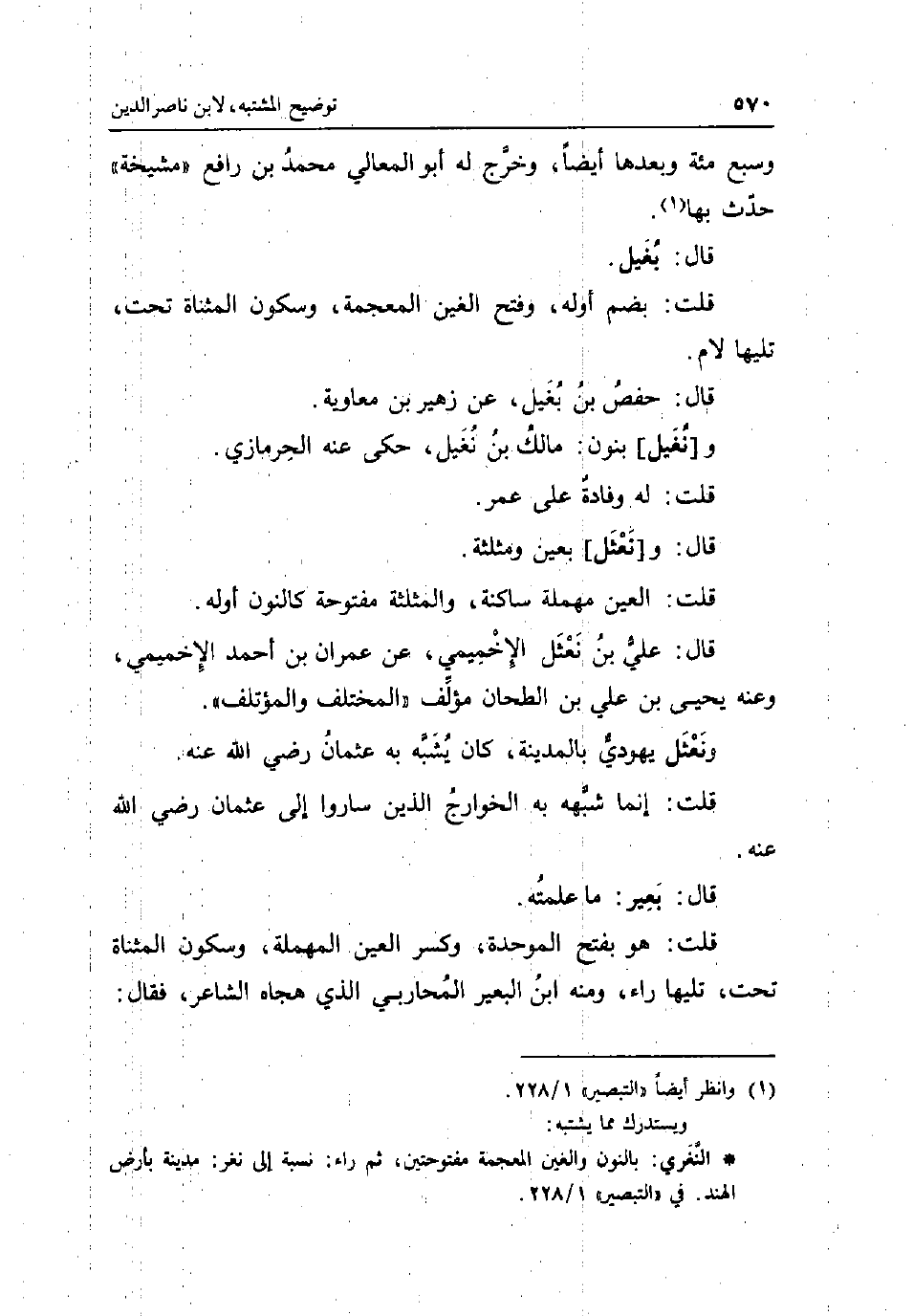 وَسبع مئة وَبعدهَا ايضا وَخرج لَهُ أَبُو لمعالي مُحَمَّد بن رَافع مشيخة حدث بهَا قَالَ: بغيل قلت: بِضَم اوله وَفتح الْغَيْن الْمُعْجَمَة وَسُكُون الْمُثَنَّاة تَحت تَلِيهَا لَام قَالَ: حَفْص بن بغيل عَن زُهَيْر بن مُعَاوِيَة و [نغيل] بنُون: مَالك بن نغيل حكى عَنهُ الحرمازي قلت: لَهُ وفادة على عمر قَالَ: و [نعثل] بِعَين ومثلثة قلت: الْعين مُهْملَة سَاكِنة والمثلثة مَفْتُوحَة كالنون أَوله قَالَ: عَليّ بن نعثل الاخميمي عَن عمرَان بن أَحْمد الاخميمي وَعنهُ يحيى بن عَليّ بن الطَّحَّان مؤلف الْمُخْتَلف والمؤتلف نعثل يَهُودِيّ بِالْمَدِينَةِ كَانَ يشبه بِهِ عُثْمَان رَضِي الله عَنهُ قلت: إِنَّمَا شبهه بِهِ الْخَوَارِج الَّذين سَارُوا إِلَى عُثْمَان رَضِي الله عَنهُ قَالَ: بعير: مَا عَلمته قلت: هُوَ بِفَتْح الْمُوَحدَة وَكسر الْعين الْمُهْملَة وَسُكُون الْمُثَنَّاة تَحت تَلِيهَا رَاء وَمِنْه ابْن الْبَعِير الْمحَاربي الَّذِي هجاه الشَّاعِر فَقَالَ: