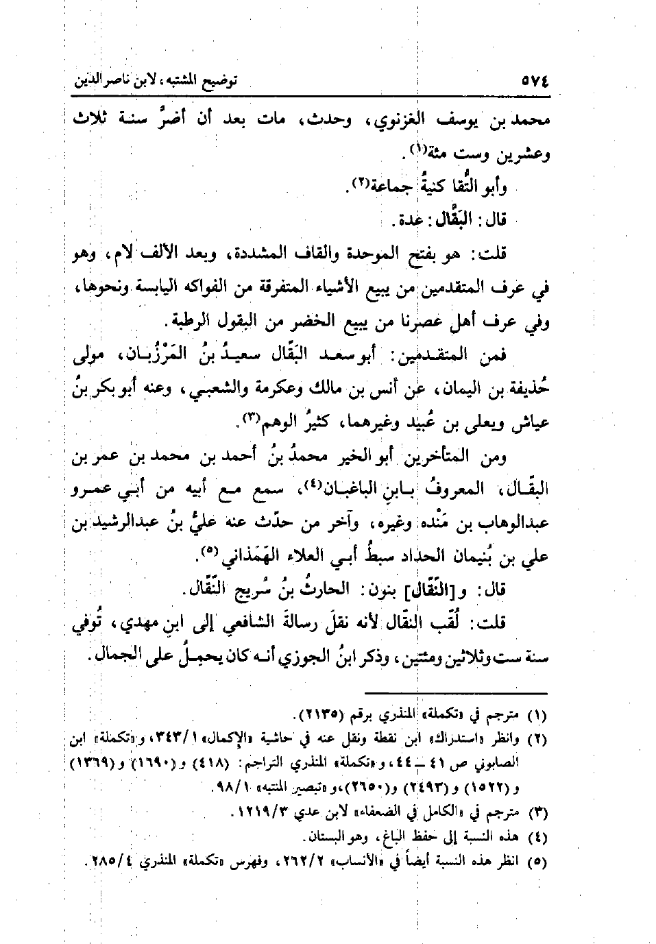 مُحَمَّد بن يُوسُف الغزنوي وَحدث مَاتَ بعد أَن اضر سنة ثَلَاث وَعشْرين وست مئة وَأَبُو التقا كنية جمَاعَة قَالَ: الْبَقَّال: عدَّة قلت: هُوَ بِفَتْح الْمُوَحدَة وَالْقَاف الْمُشَدّدَة وَبعد الْألف لَام وَهُوَ فِي عرف الْمُتَقَدِّمين من يَبِيع الْأَشْيَاء المتفرقة من الْفَوَاكِه الْيَابِسَة وَنَحْوهَا وَفِي عرف أهل عصرنا من يَبِيع الْخضر من الْبُقُول الرّطبَة فَمن الْمُتَقَدِّمين: أَبُو سعد الْبَقَّال سعيد بن الْمَرْزُبَان مولى حُذَيْفَة بن الْيَمَان عَن أنس بن مَالك وَعِكْرِمَة وَالشعْبِيّ وَعنهُ أَبُو بكر بن عَيَّاش ويعلى بن عبيد وَغَيرهمَا كثير الْوَهم وَمن الْمُتَأَخِّرين أَبُو الْخَيْر مُحَمَّد بن أَحْمد بن مُحَمَّد بن عمر بن الْبَقَّال وَالْمَعْرُوف بِابْن الباغبان سمع مَعَ أَبِيه من أبي عَمْرو عبد الْوَهَّاب بن مَنْدَه وَغَيره وَآخر من حدث عَنهُ عَليّ بن عبد الرشيد بن عَليّ بن بنيمان الْحداد سبط أبي الْعَلَاء الهمذاني قَالَ: و [النقال] بنُون: الْحَارِث بن سُرَيج النقال قلت: لقب النقال لِأَنَّهُ نقل رِسَالَة الشَّافِعِي إِلَى ابْن مهْدي توفّي سنة سِتّ وَثَلَاثِينَ ومئتين وَذكر ابْن الْجَوْزِيّ انه كَانَ يحمل على الْجمال.