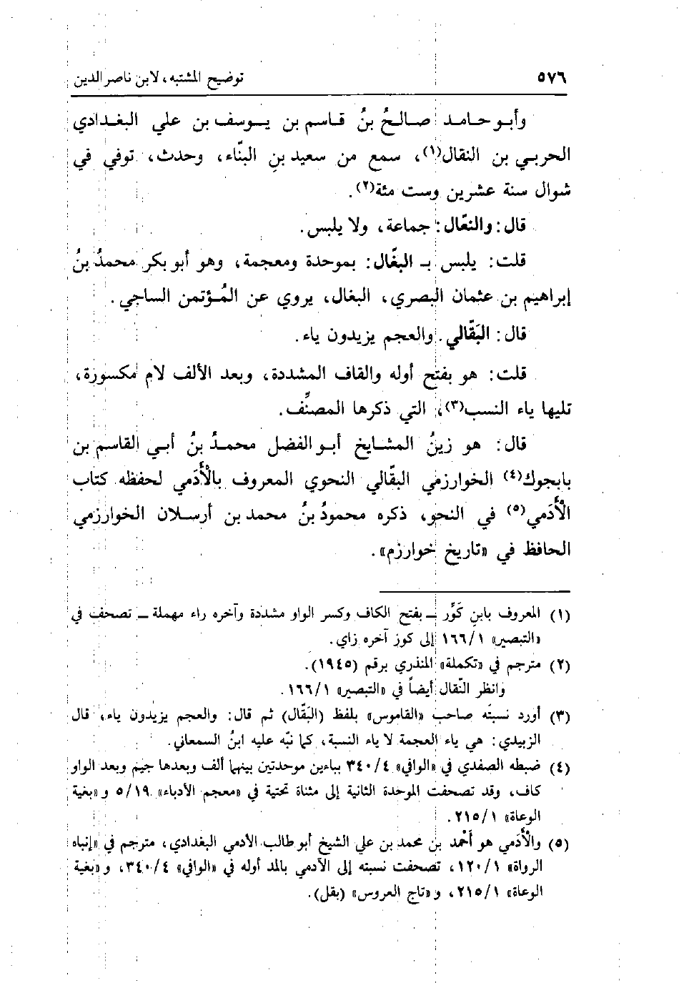 وَأَبُو حَامِد صَالح بن قَاسم بن يُوسُف بن عَليّ الْبَغْدَادِيّ الْحَرْبِيّ بن النقال سمع من سعيد بن الْبناء وَحدث توفّي فِي شَوَّال سنة عشْرين وست مئة قَالَ: وَالنعال: جمَاعَة وَلَا يلبس قلت: يلبس ب البغال: بموحدة ومعجمة وَهُوَ أَبُو بكر مُحَمَّد بن إِبْرَاهِيم بن عُثْمَان الْبَصْرِيّ البغال يروي عَن المؤتمن السَّاجِي قَالَ: البقالي والعجم يزِيدُونَ يَاء قلت: هُوَ بِفَتْح أَوله وَالْقَاف الْمُشَدّدَة وَبعد الْألف لَام مَكْسُورَة تَلِيهَا يَاء النّسَب الَّتِي ذكرهَا المُصَنّف قَالَ: هُوَ زين الْمَشَايِخ أَبُو الْفضل مُحَمَّد بن أبي الْقَاسِم بن بابجوك الْخَوَارِزْمِيّ البقالي النَّحْوِيّ الْمَعْرُوف بالأدمي لحفظه كتاب الادمي فِي النَّحْو ذكره مَحْمُود بن مُحَمَّد بن ارسلان الْخَوَارِزْمِيّ الْحَافِظ فِي تَارِيخ خوارزم.