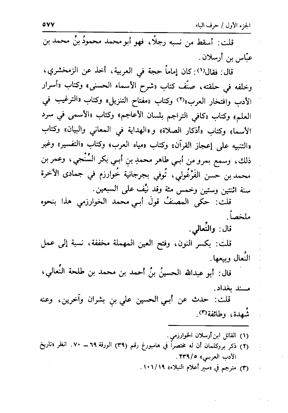 قلت: اسقط من نسبه رجلا فَهُوَ أَبُو مُحَمَّد مَحْمُود بن مُحَمَّد بن عَبَّاس بن ارسلان قَالَ: فَقَالَ: كَانَ إِمَامًا حجَّة فِي الْعَرَبيَّة اخذ عَن الزَّمَخْشَرِيّ وَخَلفه فِي حلقته صنف كتاب شرح الْأَسْمَاء الْحسنى وَكتاب اسرار الادب وافتخار الْعَرَب وَكتاب مِفْتَاح التَّنْزِيل وَكتاب التَّرْغِيب فِي الْعلم وَكتاب كَافِي التراجم بِلِسَان الاعاجم وَكتاب الاسمى فِي سرد الاسما وَكتاب أذكار الصَّلَاة وَالْهِدَايَة فِي الْمعَانِي وَالْبَيَان وَكتاب التَّنْبِيه على إعجاز الْقُرْآن وَكتاب مياه الْعَرَب وَكتاب التَّفْسِير وَغير ذَلِك وَسمع بمرو من أبي طَاهِر مُحَمَّد بن أبي بكر السنجي وَعمر بن مُحَمَّد بن حسن الفرغولي توفّي بجرجانية خوارزم فِي جُمَادَى الْآخِرَة سنة اثْنَتَيْنِ وَسِتِّينَ وَخمْس مئة وَقد نَيف على السّبْعين قلت: حكى المُصَنّف قَول أبي مُحَمَّد الخوارمي هَذَا بِنَحْوِهِ مُلَخصا قَالَ: والنعالي قلت: بِكَسْر النُّون وَفتح الْعين الْمُهْملَة مُخَفّفَة نِسْبَة إِلَى عمل النِّعَال وَبَيْعهَا قَالَ: أَبُو عبد الله الْحُسَيْن بن أَحْمد بن مُحَمَّد بن طَلْحَة النعالي مُسْند بَغْدَاد قلت: حدث عَن أبي الْحُسَيْن عَليّ بن بَشرَان وَآخَرين وَعنهُ شهدة وَطَائِفَة.