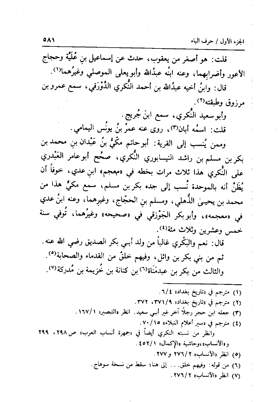 قلت: هُوَ اصغر من يَعْقُوب حدث عَن إِسْمَاعِيل بن علية وحجاج الْأَعْوَر وأضرابهما وَعنهُ ابْنه عبد الله وَأَبُو يعلى الْموصِلِي وَغَيرهمَا قَالَ: وَابْن أَخِيه عبد الله بن أَحْمد النكري الدَّوْرَقِي سمع عَمْرو بن مَرْزُوق وطبقته وَأَبُو سعيد النكري سمع ابْن جريج قلت: اسْمه أبان روى عَنهُ عمر بن يُونُس اليمامي وَمِمَّنْ ينْسب إِلَى الْقرْيَة: أَبُو حَاتِم مكي بن عَبْدَانِ بن محم بن بكر بن مُسلم بن رَاشد النَّيْسَابُورِي النكرين صحّح أَبُو عَامر الْعَبدَرِي على النكري هَذَا ثَلَاث مَرَّات بِخَطِّهِ فِي مُعْجم ابْن عدي خوفًا أَن يظنّ انه بِالْمُوَحَّدَةِ نسب إِلَى جده بكر بن مُسلم سمع مكي هَذَا من مُحَمَّد بن يحيى الذهلي وَمُسلم بن الْحجَّاج وَغَيرهمَا وَعنهُ ابْن عدي فِي مُعْجَمه وَأَبُو بكر الجوزقي فِي صَحِيحه وَغَيرهمَا توفّي سنة خمس وَعشْرين وَثَلَاث مئة قَالَ: نعم والبكري غَالِبا من ولد أبي بكر الصّديق رَضِي الله عَنهُ ثمَّ من بني بكر بن وَائِل وَفِيهِمْ خلق من القدماء وَالصَّحَابَة وَالثَّالِث من بكر بن عبدمناة بن كنَانَة بن خُزَيْمَة بن مدركة.