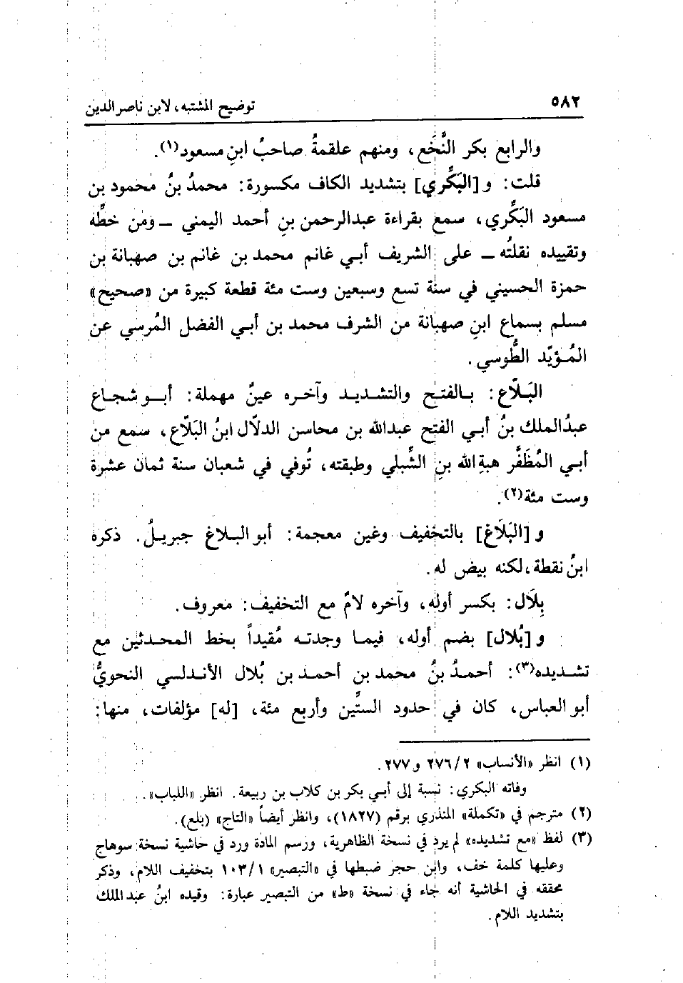 وَالرَّابِع بكر النخع وَمِنْهُم عَلْقَمَة صَاحب ابْن مَسْعُود قلت: و [الْبكْرِيّ] بتَشْديد الْكَاف مَكْسُورَة: مُحَمَّد بن مَحْمُود بن مَسْعُود الْبكْرِيّ سمع بِقِرَاءَة عبد الرَّحْمَن بن أَحْمد اليمني - وَمن خطه وتقييده نقلته - على الشريف أبي غَانِم مُحَمَّد بن غَانِم بن صهبانة بن حَمْزَة الْحُسَيْنِي فِي سنة تسع وَسبعين وست مئة قِطْعَة كَبِيرَة من صَحِيح مُسلم بِسَمَاع ابْن صهبانة من الشّرف مُحَمَّد بن أبي الْفضل المرسي عَن الْمُؤَيد الطوسي الْبَلَاغ: بِالْفَتْح وَالتَّشْدِيد وَآخره عين مُهْملَة: أَبُو شُجَاع عبد الْملك بن أبي الْفَتْح عبد الله بن محَاسِن الدَّلال ابْن البلاع سمع من أبي المظفر هبة الله بن الشبلي وطبقته توفّي فِي شعْبَان سنة ثَمَان عشرَة وست مئة و [الْبَلَاغ] بِالتَّخْفِيفِ وَغير مُعْجمَة: أَبُو الْبَلَاغ جِبْرِيل ذكره ابْن نقطة لكنه بيض لَهُ بِلَال: بِكَسْر اوله وَآخره لَام مَعَ التَّخْفِيف: مَعْرُوف و [بِلَال: بِكَسْر اوله وَآخره لَام مَعَ التَّخْفِيف: مَعْرُوف و [بِلَال] بِضَم اوله فِيمَا وجدته مُقَيّدا بِخَط الْمُحدثين مَعَ تشديده: أَحْمد بن مُحَمَّد بن أَحْمد بن بِلَال الأندلسي النَّحْوِيّ أَبُو الْعَبَّاس كَانَ فِي حُدُود السِّتين وَأَرْبع مئة [لَهُ] مؤلفات مِنْهَا: