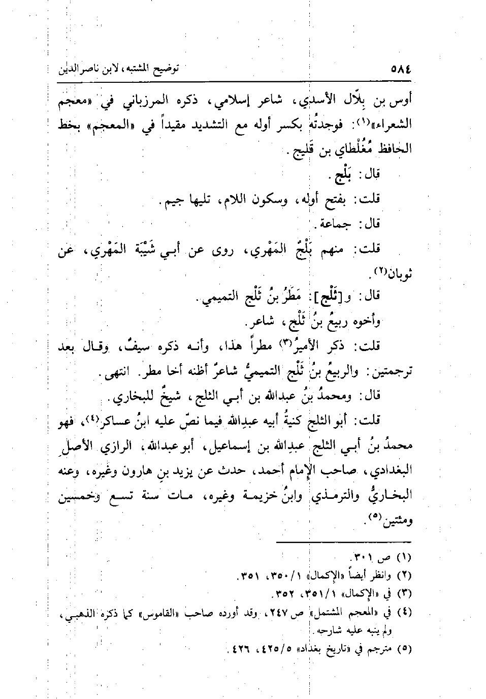 أَوْس بن بِلَال الاسدي شَاعِر إسلامي ذكره المرزباني فِي مُعْجم الشُّعَرَاء: فَوَجَدته بِكَسْر أَوله مَعَ التَّشْدِيد مُقَيّدا فِي المعجم بِخَط الْحَافِظ مغلطاي بن قليج قَالَ: بلج قلت: بِفَتْح اوله وَسُكُون اللَّام تَلِيهَا جِيم قَالَ: جمَاعَة قلت: مِنْهُم بلج الْمهرِي روى عَن أبي شيبَة الْمهرِي عَن ثَوْبَان قَالَ: و [ثلج] : مطر بن ثلج التَّمِيمِي وَأَخُوهُ ربيع بن ثلج شَاعِر قلت: ذكر الْأَمِير مَطَرا هَذَا وانه ذكره سيف وَقَالَ بعد ترجمتين: وَالربيع بن ثلج التَّمِيمِي شَاعِر اظنه اخا مطر انْتهى قَالَ: وَمُحَمّد بن عبد الله بن أبي الثَّلج شيخ للْبُخَارِيّ قلت: أَبُو الثَّلج كنية أَبِيه عبد الله فِيمَا نَص عَلَيْهِ ابْن عَسَاكِر فَهُوَ مُحَمَّد بن أبي الثَّلج عبد الله بن اسماعيل أَبُو عبد الله الرَّازِيّ الأَصْل الْبَغْدَادِيّ صَاحب الإِمَام احْمَد حدث عَن يزِيد بن هَارُون وَغَيره وَعنهُ البُخَارِيّ وَالتِّرْمِذِيّ وَابْن خُزَيْمَة وَغَيره مَاتَ سنة تسع وَخمسين ومئتين.