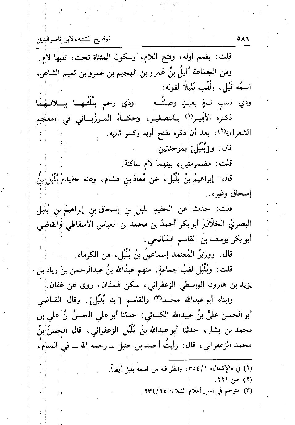 ذكره الْأَمِير بِالتَّصْغِيرِ وَحَكَاهُ المرزباني فِي مُعْجم الشُّعَرَاء بعد أَن ذكره بِفَتْح أَوله وَكسر ثَانِيه قَالَ: و [بلبل] بموحدتين قلت: مضمومتين بَينهمَا لَام سَاكِنة قَالَ: إِبْرَاهِيم بن بلبل عَن معَاذ بن هِشَام وَعنهُ حفيده بلبل بن إِسْحَاق وَغَيره قلت: حدث عَن الْحَفِيد بلبل بن إِسْحَاق بن إِبْرَاهِيم بن بلبل الْبَصْرِيّ الْخلال أَبُو بكر أَحْمد بن مُحَمَّد بن الْعَبَّاس الاسفاطي وَالْقَاضِي أَبُو بكر يُوسُف بن الْقَاسِم الميانجي قَالَ: ووزير الْمُعْتَمد إِسْمَاعِيل بن بلبل من الكرماء قلت: وبلبل لقب جمَاعَة مِنْهُم عبد الله بن عبد الرَّحْمَن بن زِيَاد بن يزِيد بن هَارُون الوَاسِطِيّ الزَّعْفَرَانِي سكن همذان روى عَن عَفَّان وابناه أَبُو عبد الله مُحَمَّد وَالقَاسِم [ابْنا بلبل] وَقَالَ القَاضِي أَبُو الْحسن عَليّ بن عبيد الله الْكسَائي: حَدثنَا أَبُو عَليّ الْحسن بن عَليّ بن مُحَمَّد بن بشار حَدثنَا أَبُو عبد الله بن بلبل الزَّعْفَرَانِي قَالَ الْحسن بن مُحَمَّد الزَّعْفَرَانِي قَالَ: رَأَيْت أَحْمد بن حَنْبَل - رَحمَه الله - فِي الْمَنَام